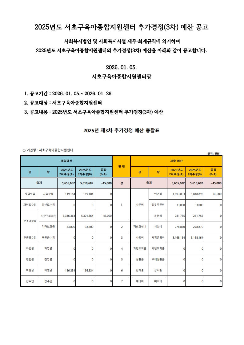 2025년도 서초구육아종합지원센터 추가경정(3차) 예산 공고