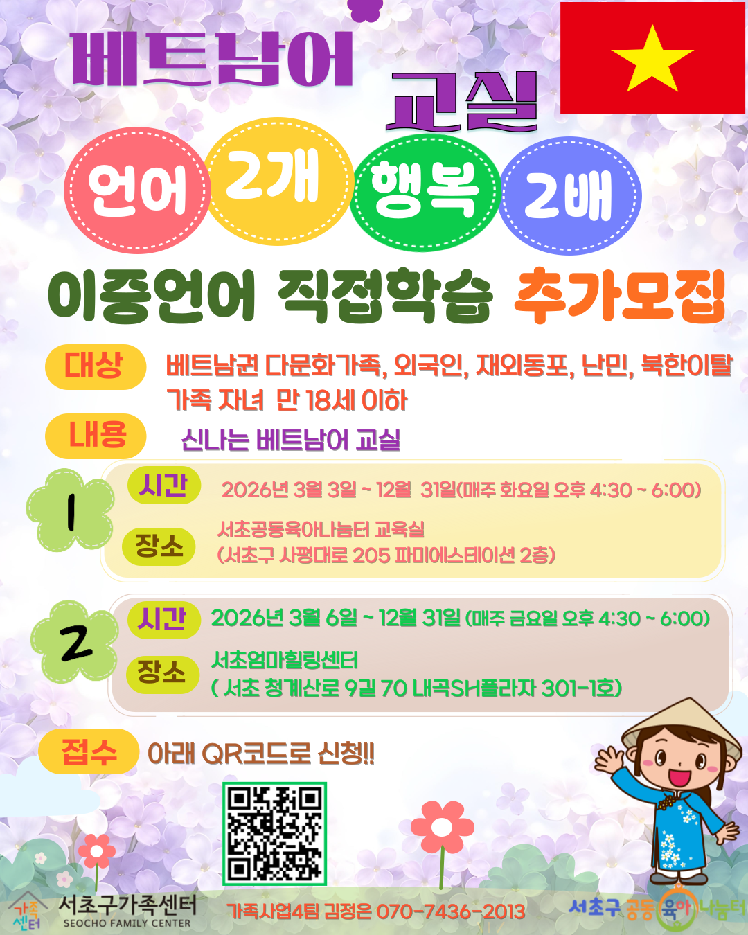 [가정양육] [서초구 가족센터] 2026년 '언어 2개, 행복 2배' 이중언어 직접학습사업 참여자 추가 모집 안내_베트남어/러시아어교실
