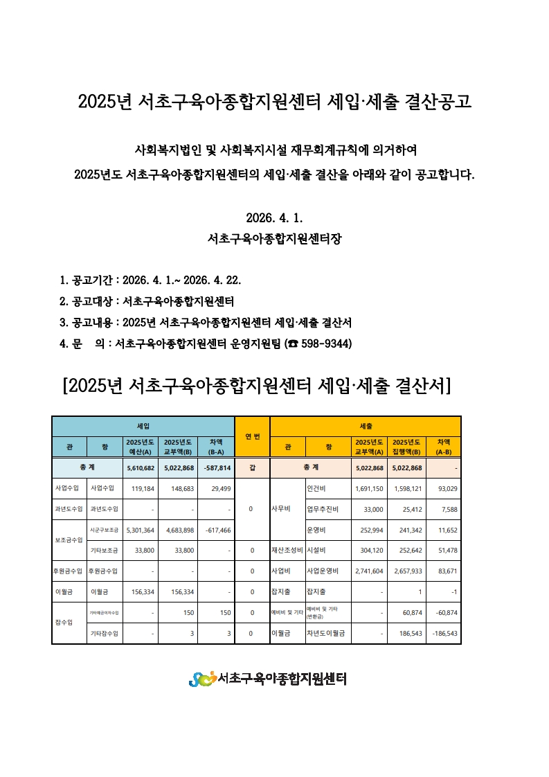 2025년 서초구육아종합지원센터 세입·세출 결산공고