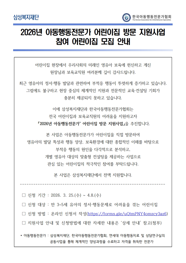 [어린이집] [삼성복지재단] 2026년 아동행동전문가 어린이집 방문 지원사업 참여 어린이집 모집 안내