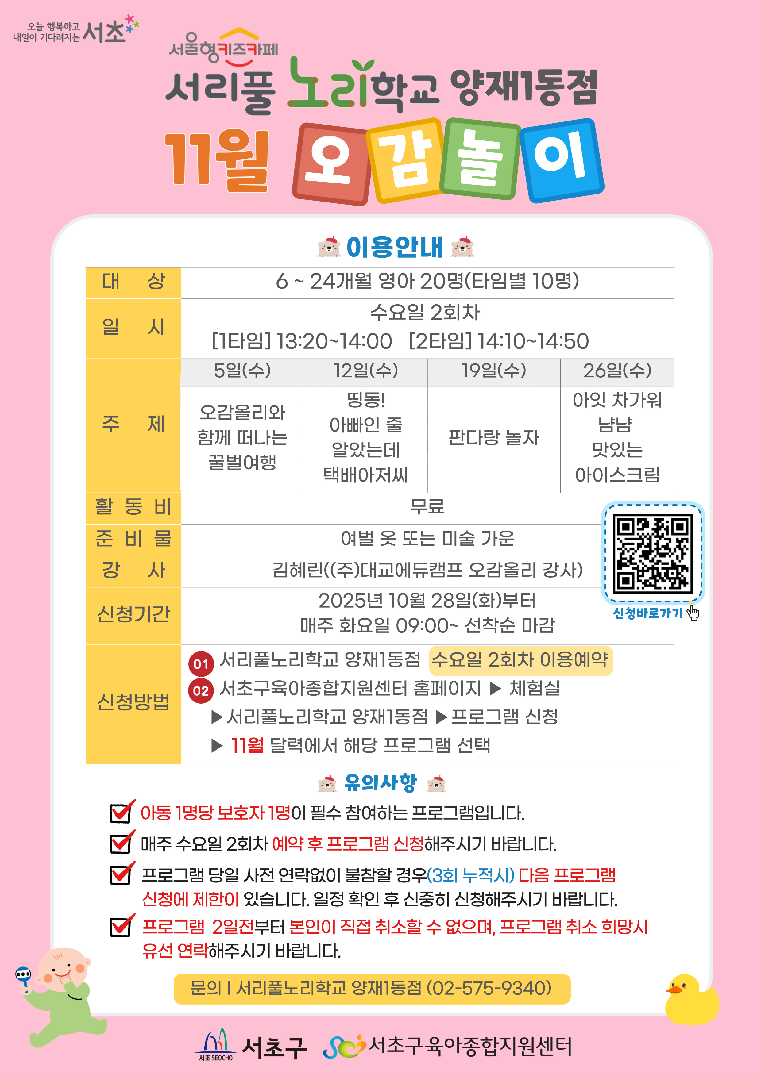 - 프로그램 2일 전부터는 본인이 직접 취소할 수 없으며, 프로그램 취소 희망 시 서리풀노리학교 양재1동점(02-575-9340)으로 전화주시기 바랍니다.