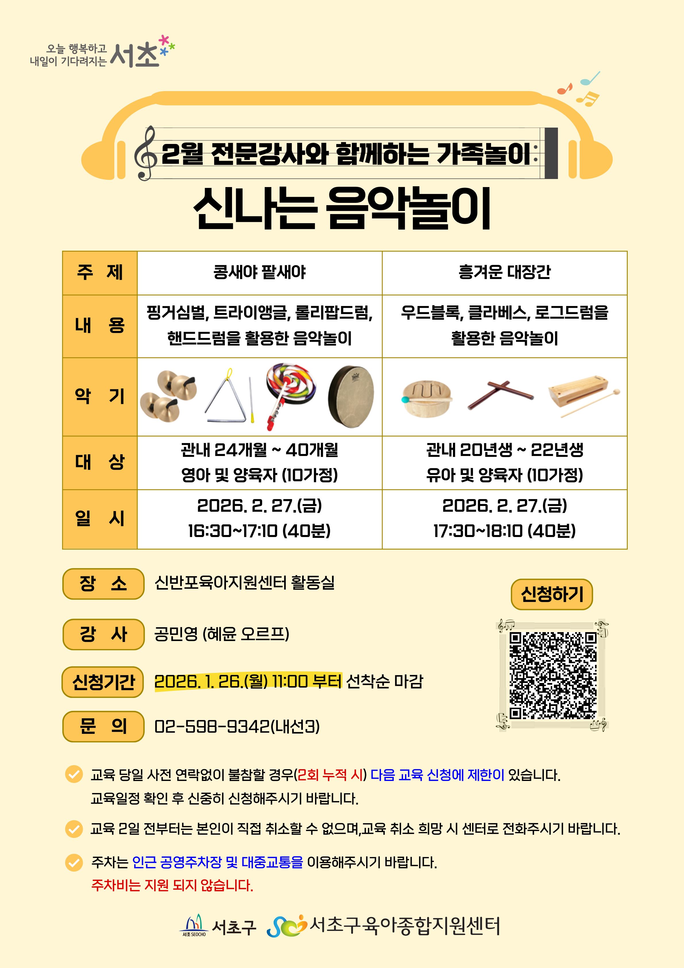서초구육아종합지원센터 2월 전문강사와 함께하는 가족놀이 '신나는 음악놀이'안내입니다.