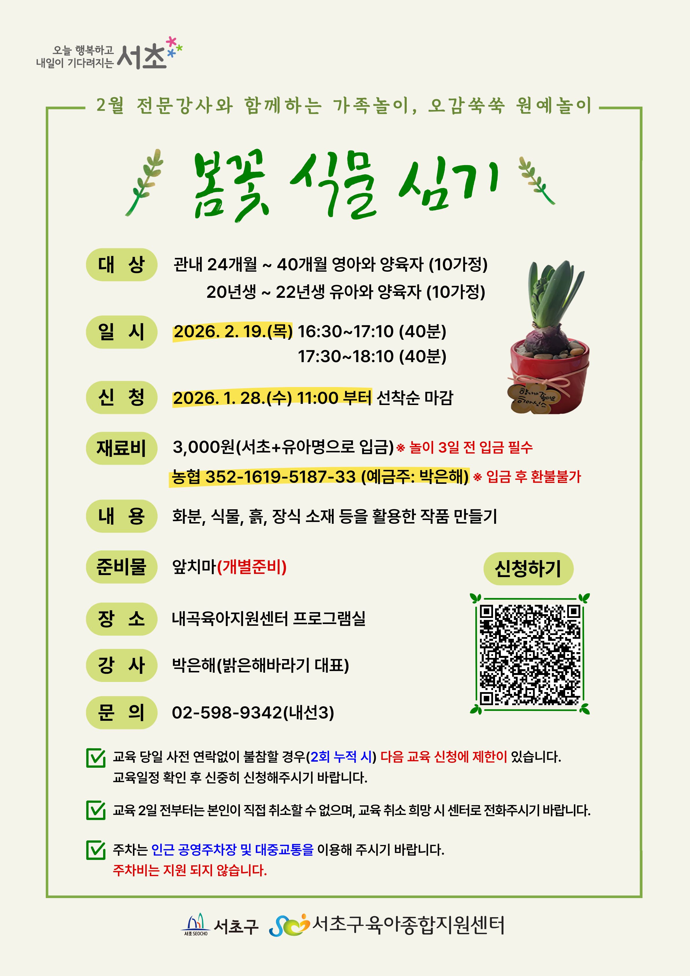 서초구육아종합지원센터 2월 전문강사와 함께하는 가족놀이 '오감쑥쑥 원예놀이'안내입니다.