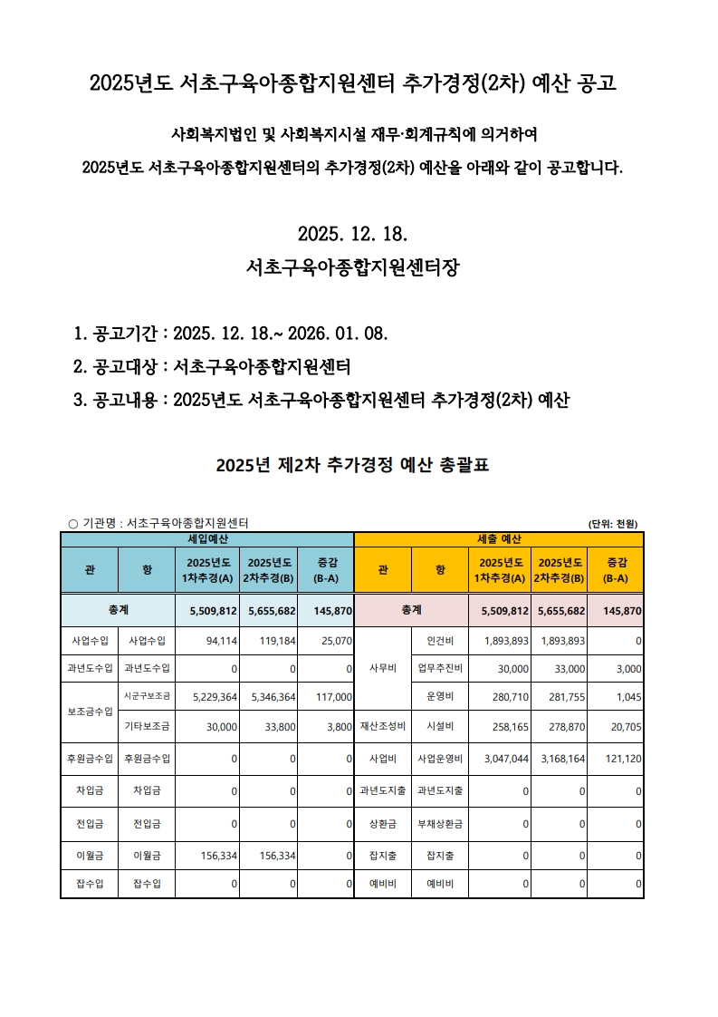 2025년도 서초구육아종합지원센터 추가경정(2차) 예산 공고