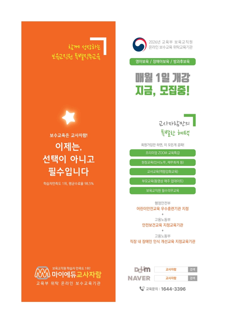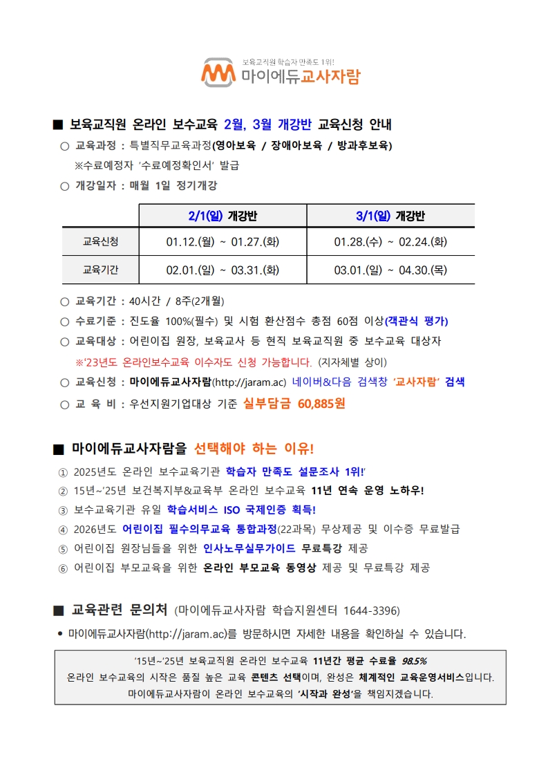 [어린이집] [마이에듀교사자람] 보육교직원 온라인 보수교육 2월, 3월 개강반 교육신청 안내