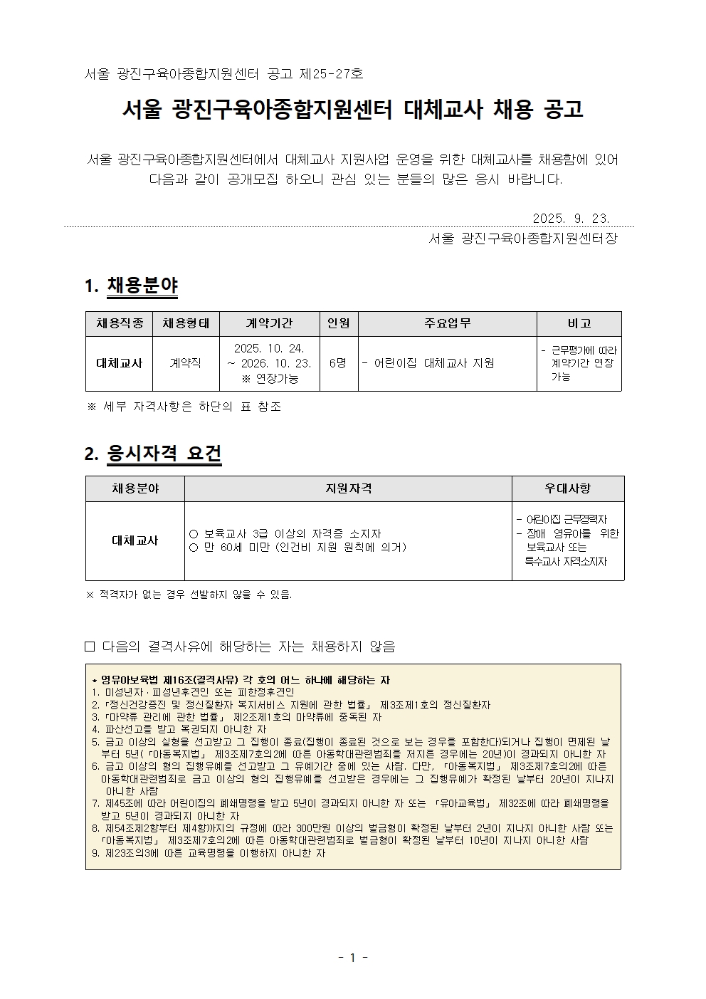 붙임 1. 서울 광진구육아종합지원센터 대체교사 채용공고(제25-27호).pdf