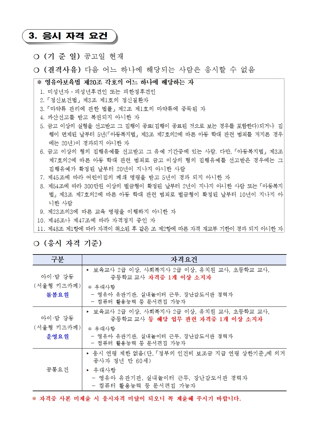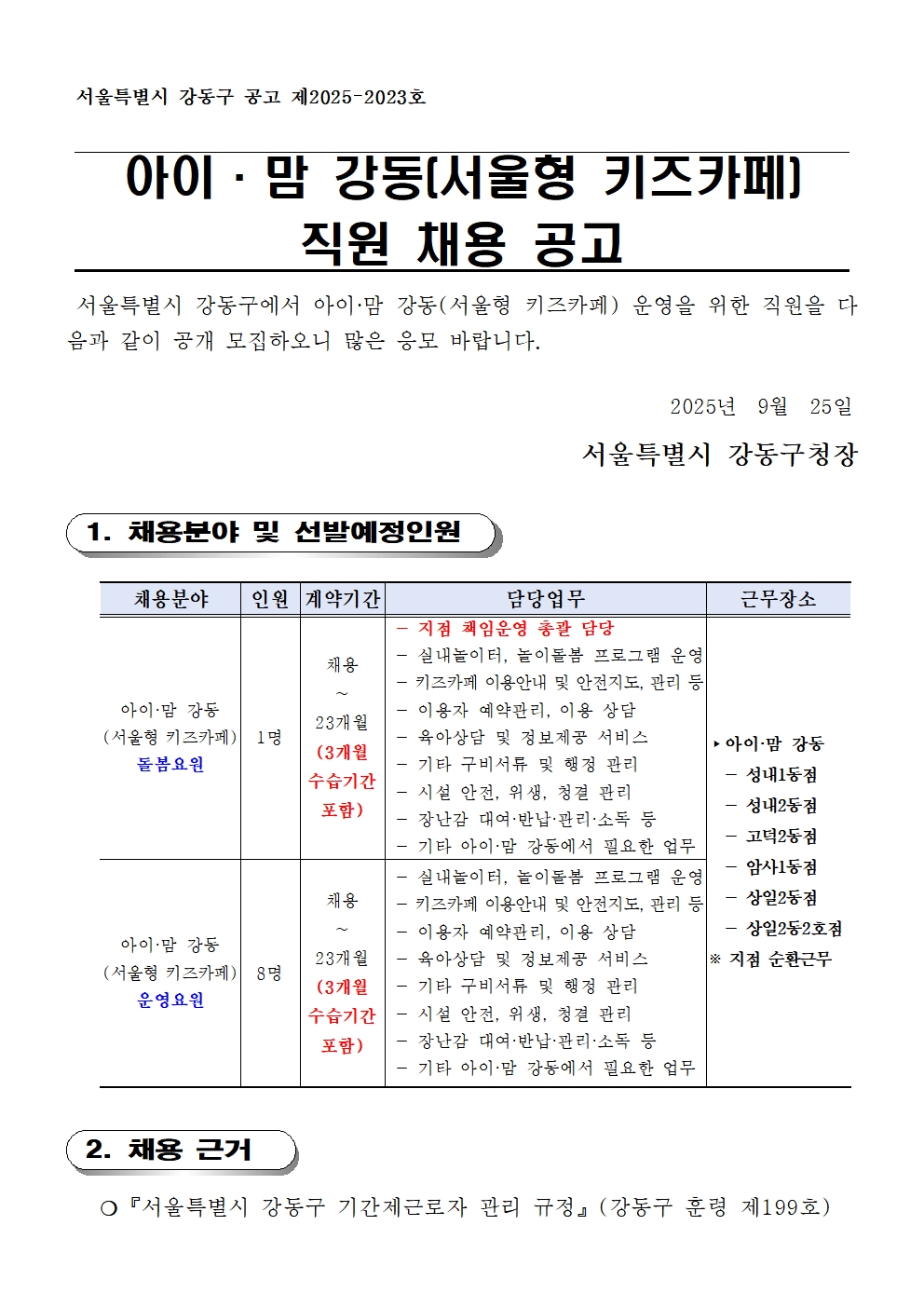 [서울 강동구육아종합지원센터] 아이맘강동 서울형 키즈카페 직원(돌봄요원, 운영요원) 채용 공고