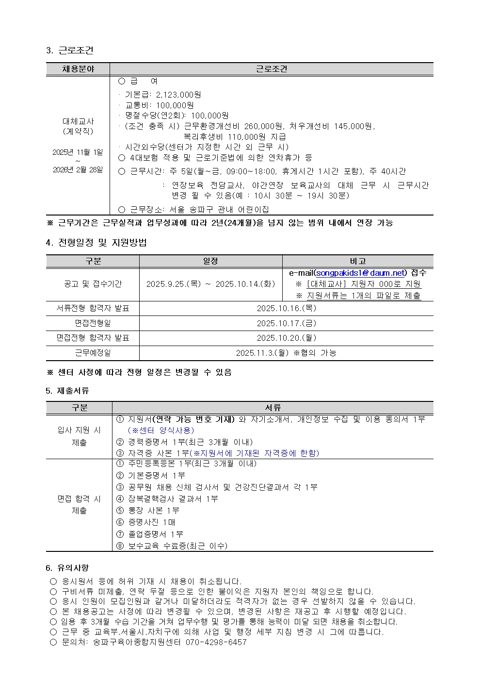 [서울 송파구육아종합지원센터] 대체교사 채용 공고