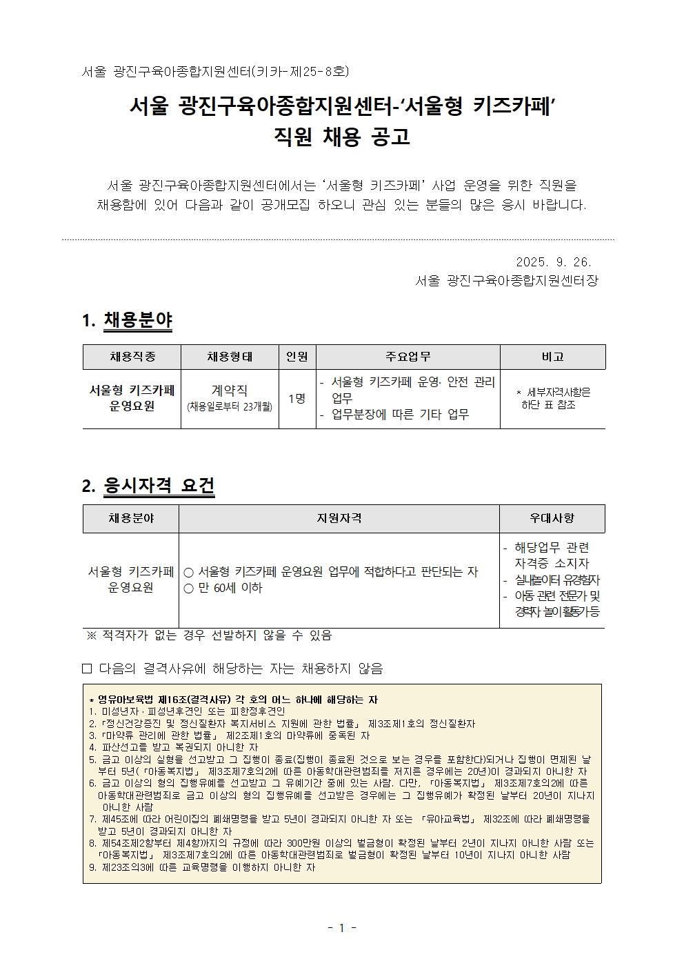붙임 1. 서울 광진구육아종합지원센터-_서울형 키즈카페_ 직원 채용 공고(키카-제25-8호).hwp