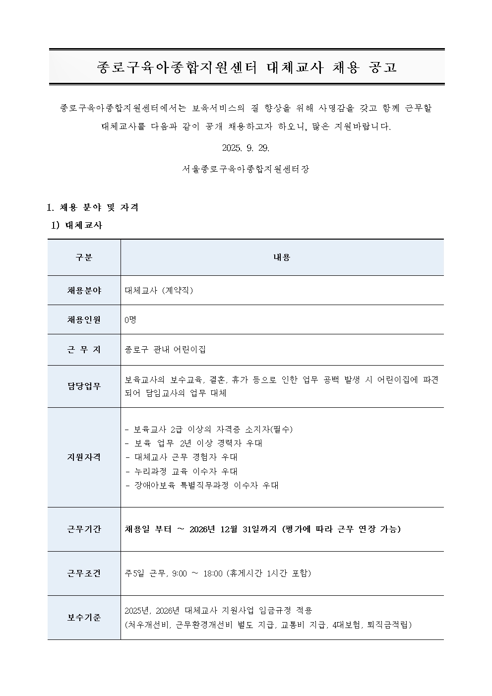 붙임 1. 종로구육아종합지원센터 대체교사 채용 공고문(25 0929).hwp