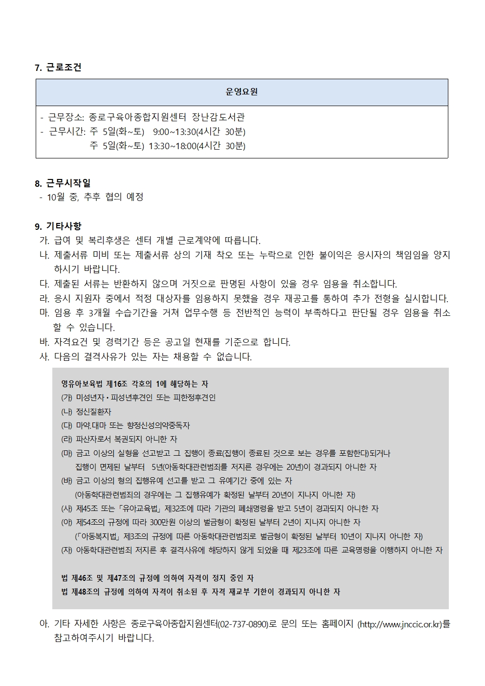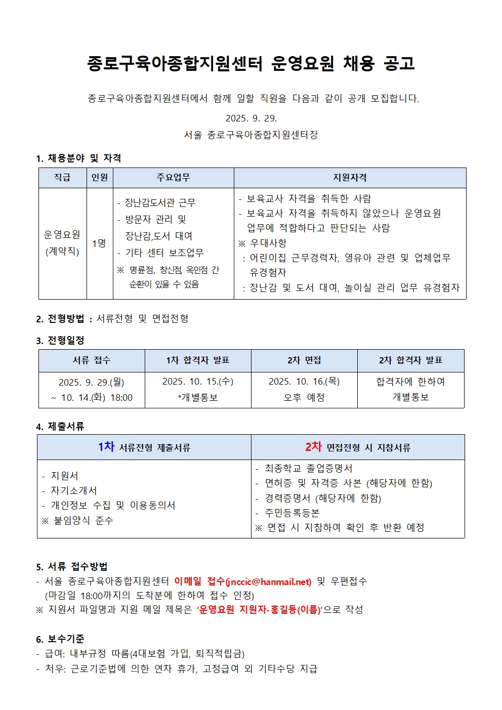 붙임 3. 종로구육아종합지원센터 운영요원 채용 공고문(25 0929).hwp