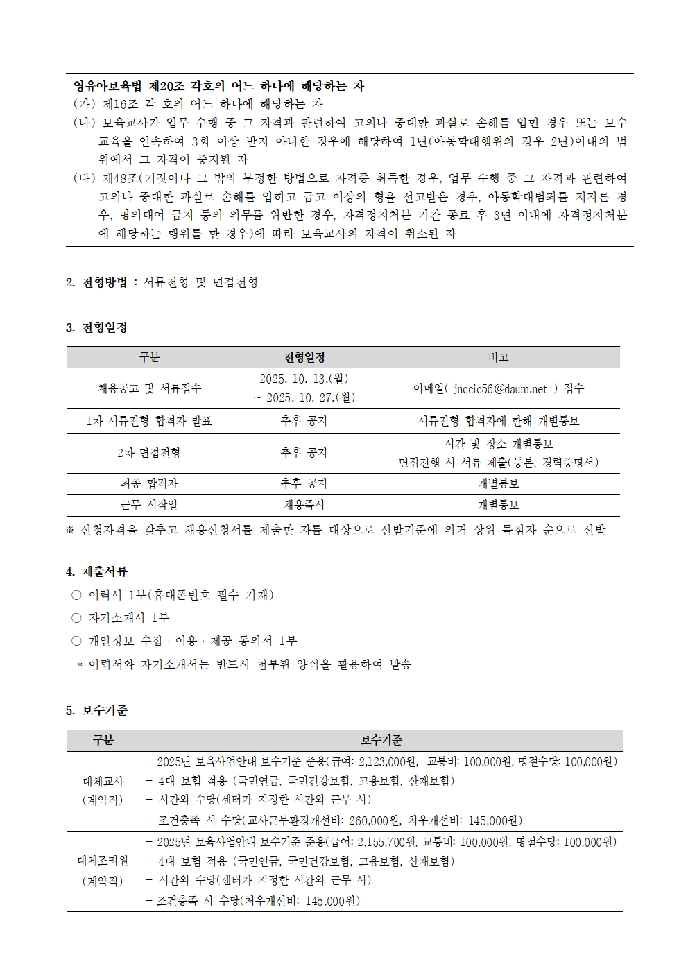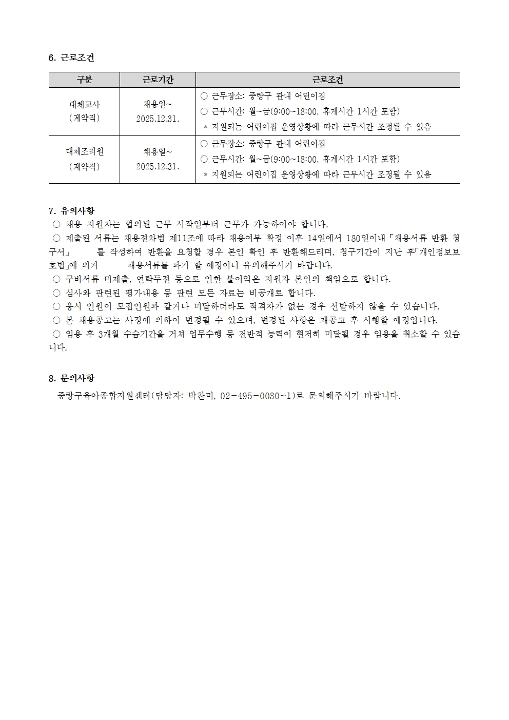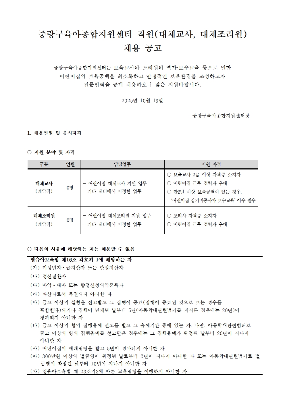 [서울 중랑구육아종합지원센터] 대체교사, 대체조리원 채용 공고