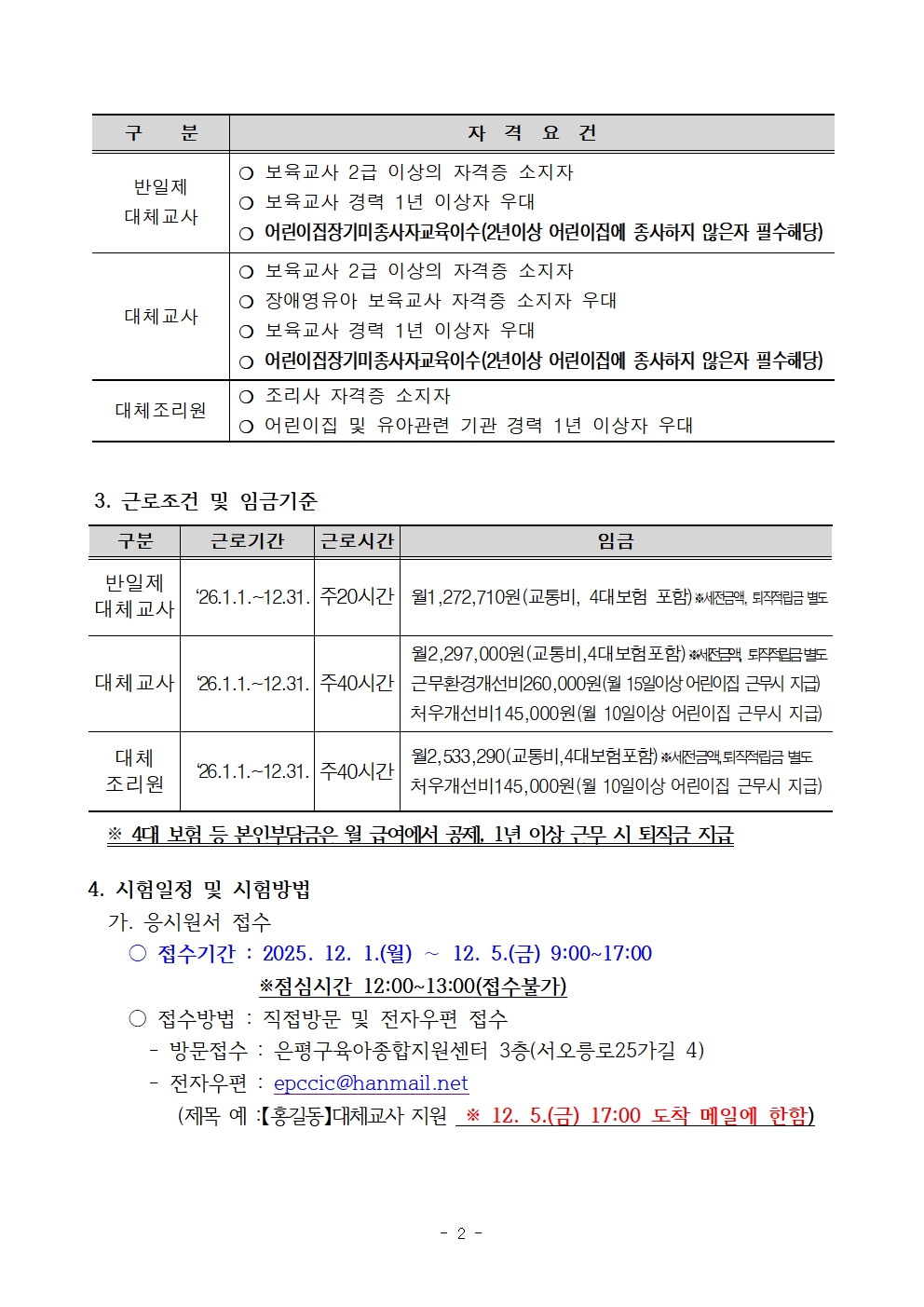 [서울 은평구육아종합지원센터] 기간제 근로자(반일제대체교사, 대체교사, 대체조리원) 채용 공고