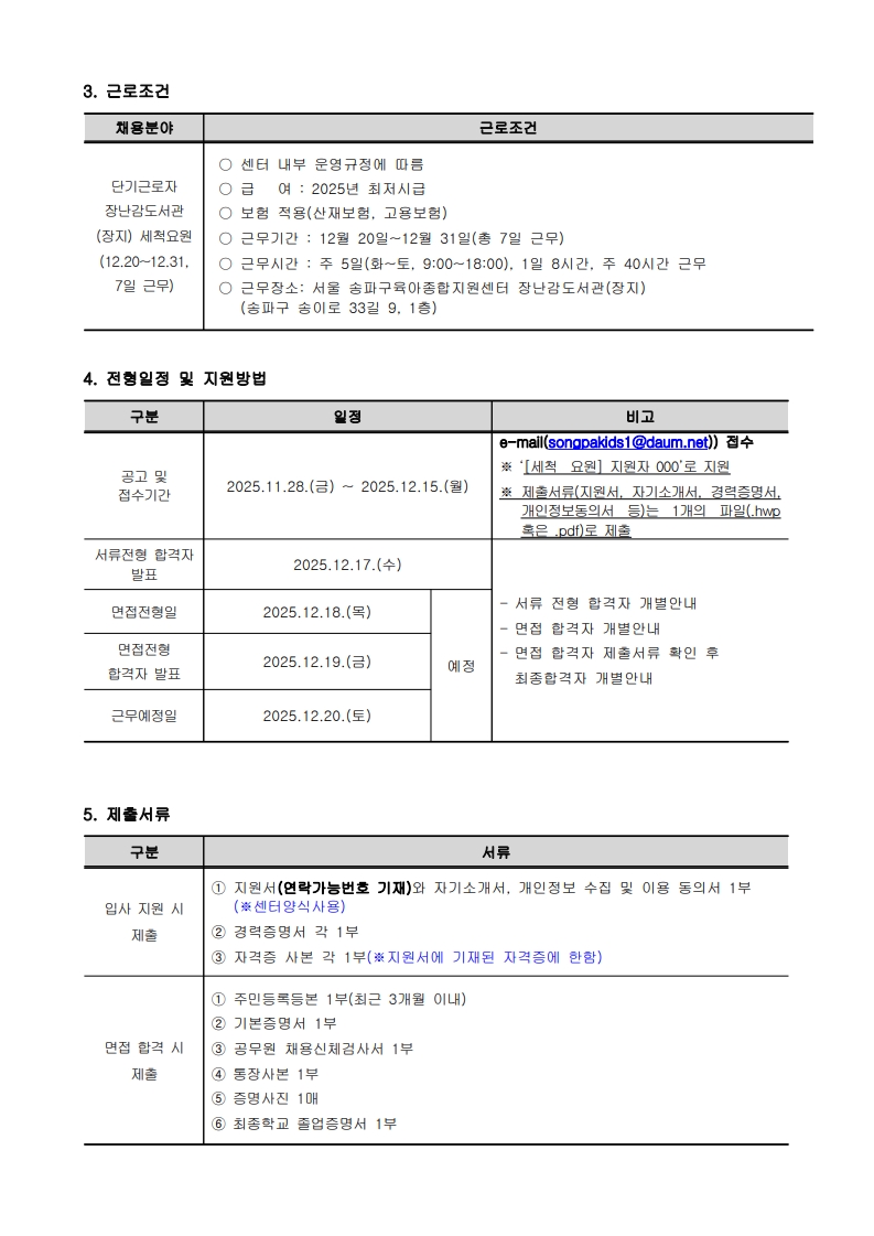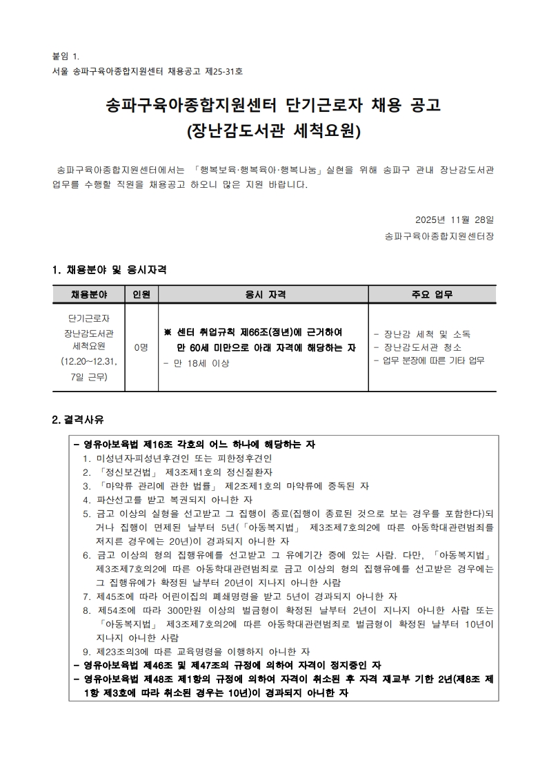 [서울 송파구육아종합지원센터] 단기근로자(장난감도서관 세척요원) 채용 공고