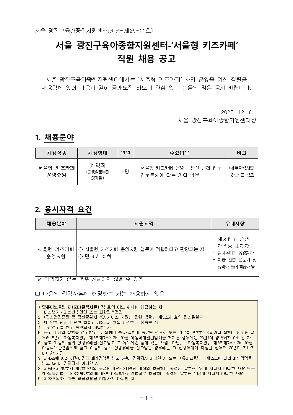 붙임 1. 서울 광진구육아종합지원센터-_서울형 키즈카페_ 직원 채용 공고(키카-제25-11).pdf