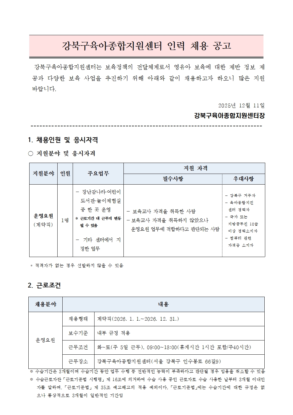[서울 강북구육아종합지원센터] 운영요원 채용 공고