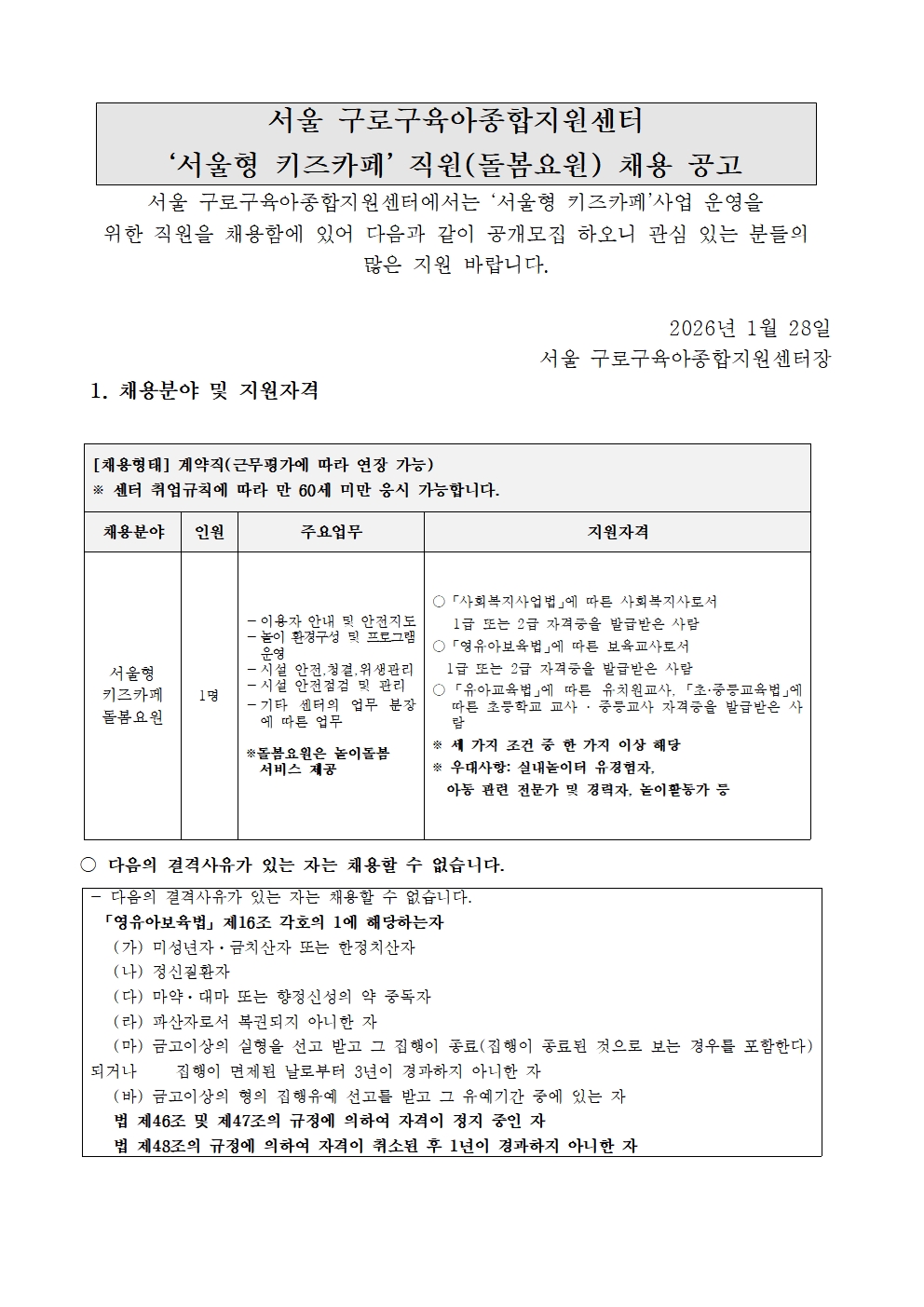붙임 1. 서울 구로구육아종합지원센터 서울형 키즈카페 직원(돌봄요원) 채용 모집 공고문.pdf