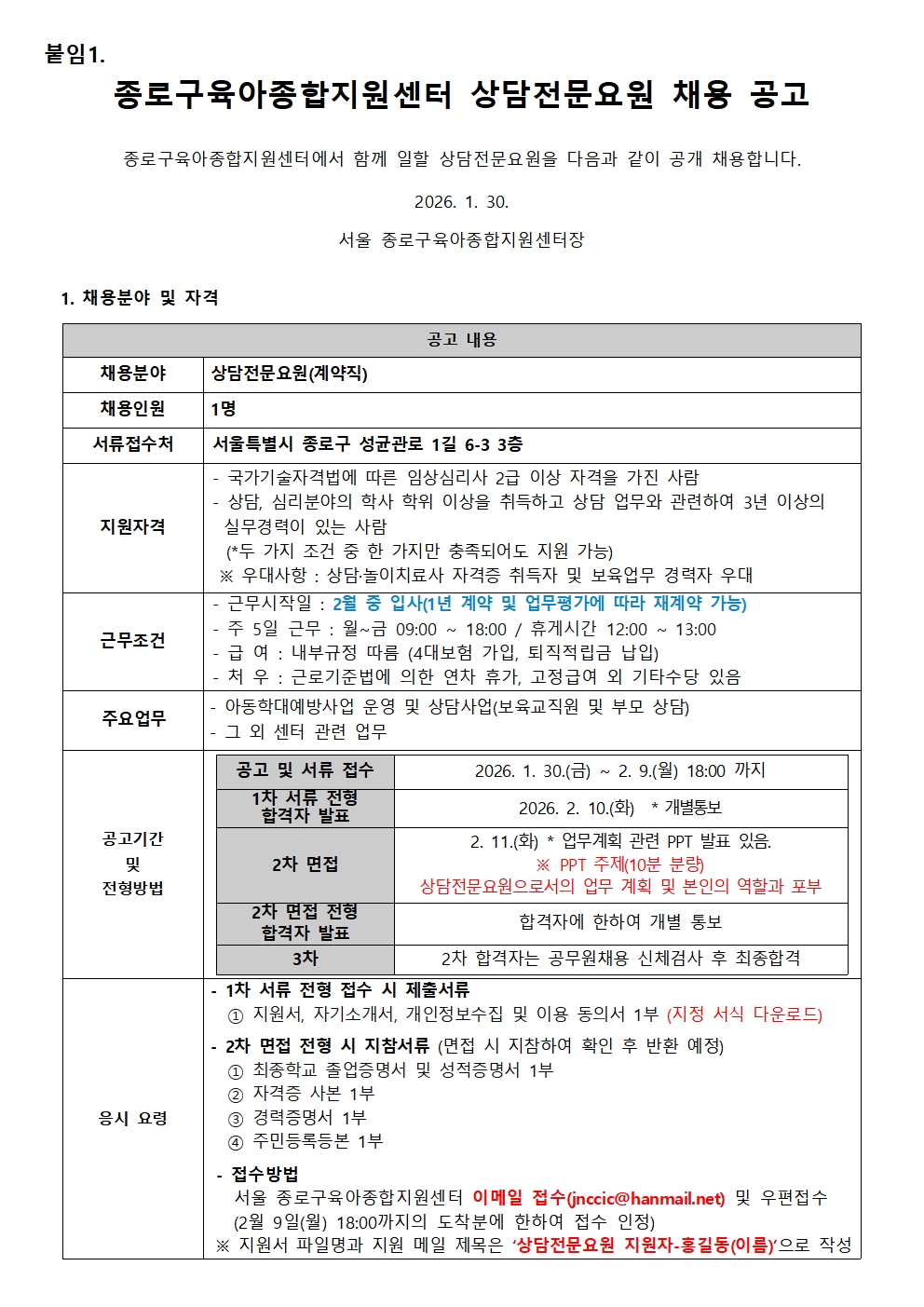 붙임 1. 종로구육아종합지원센터 상담전문요원 채용 공고문(26 0130).pdf