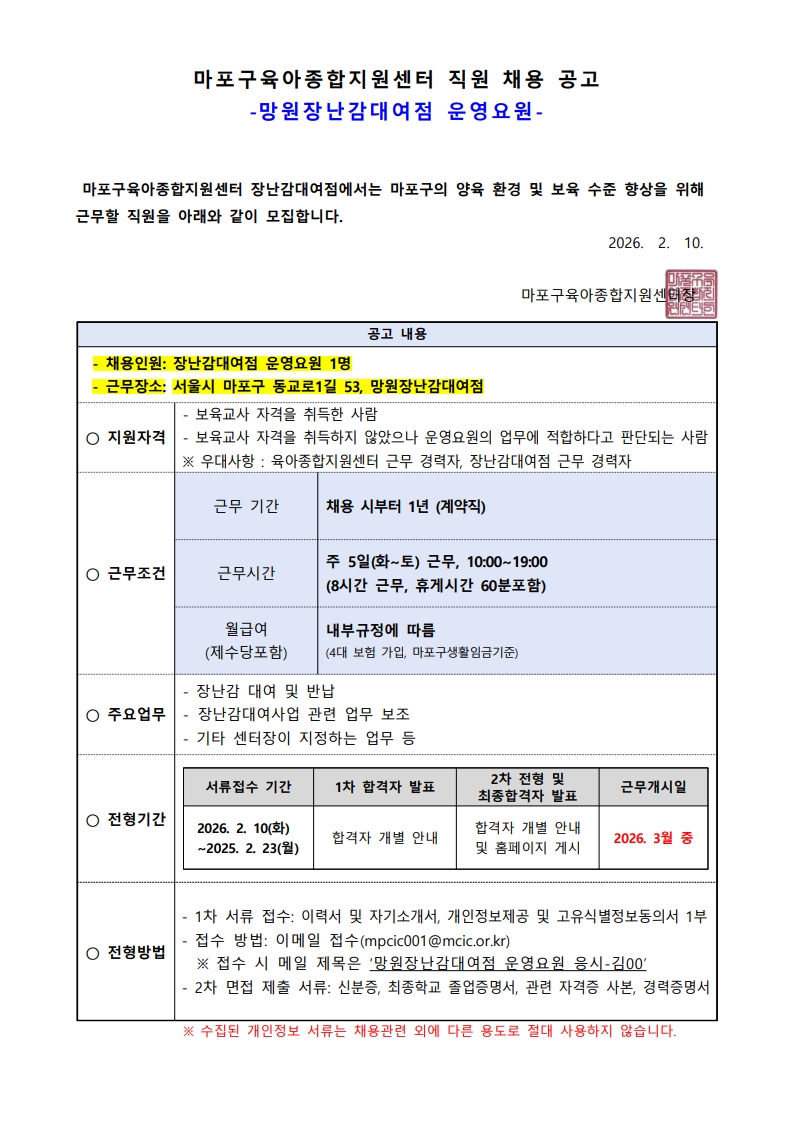 붙임 1. 마포구육아종합지원센터 직원 채용 공고(망원장난감대여점 운영요원).pdf