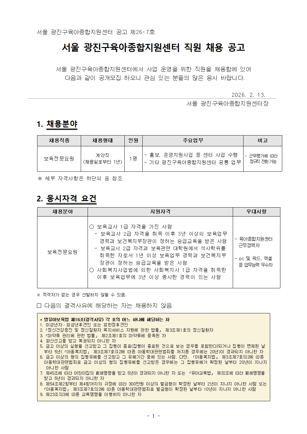 붙임1. 서울 광진구육아종합지원센터 직원 채용 공고 (제26-7호).pdf