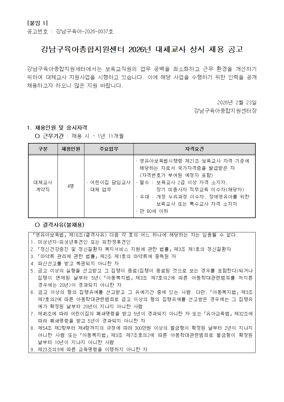 [서울 강남구육아종합지원센터] 2026년 대체교사 상시 채용 공고