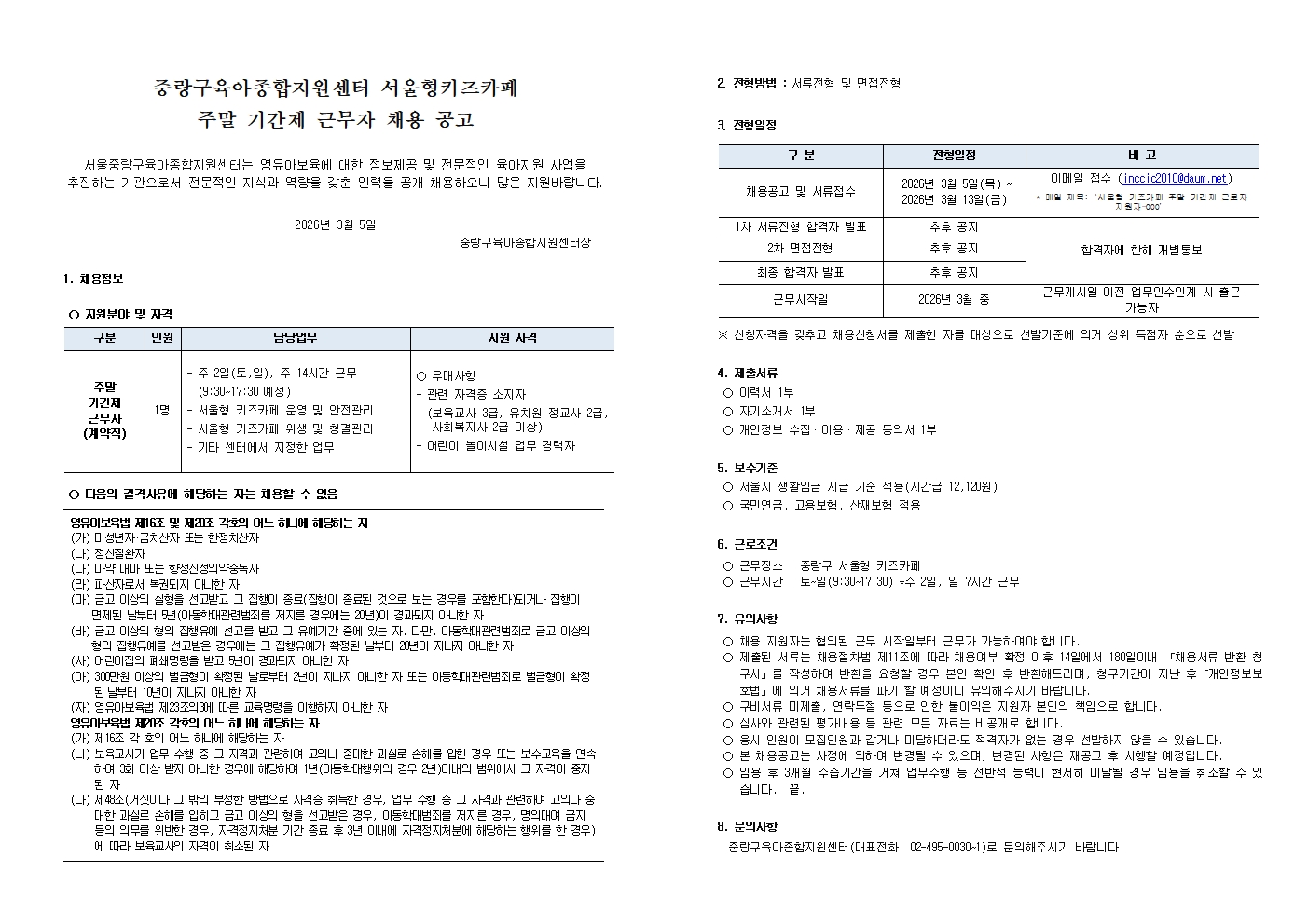 [서울 중랑구육아종합지원센터] 서울형 키즈카페 주말 기간제 근무자 채용 공고