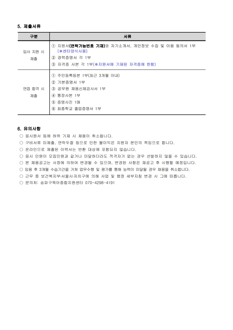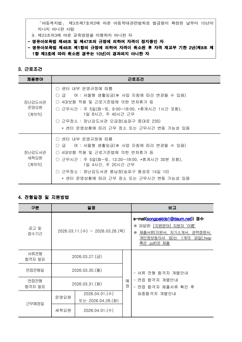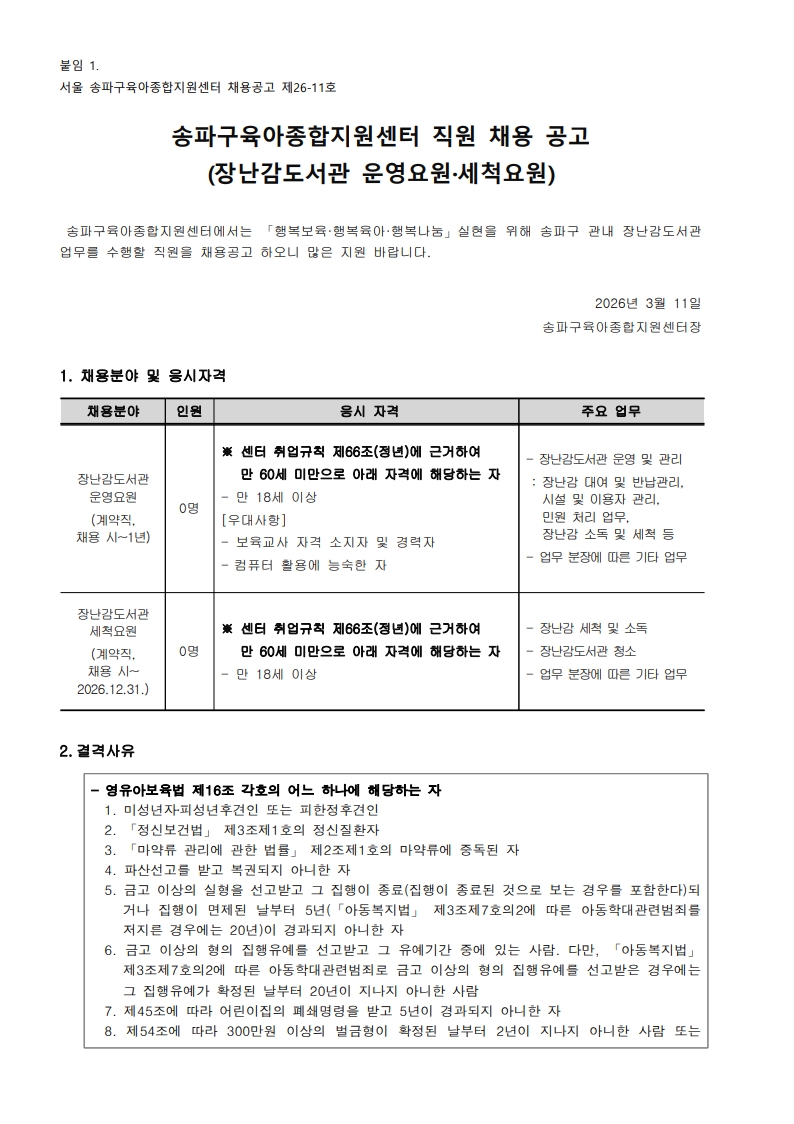 [서울 송파구육아종합지원센터] 장난감도서관 운영요원·세척요원 채용 공고