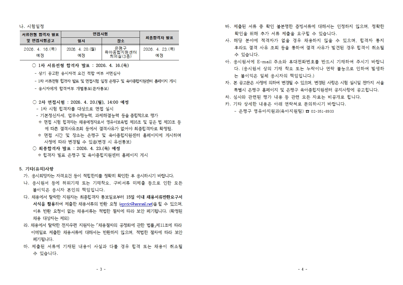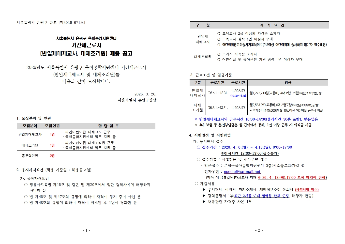 [서울 은평구육아종합지원센터] 기간제근로자(반일제대체교사, 대체조리원) 채용 공고