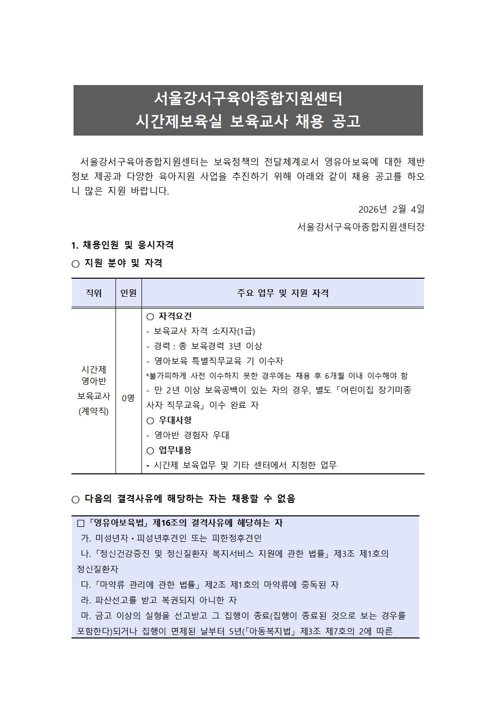 [서울 강서구육아종합지원센터] 시간제보육실 보육교사 채용 공고