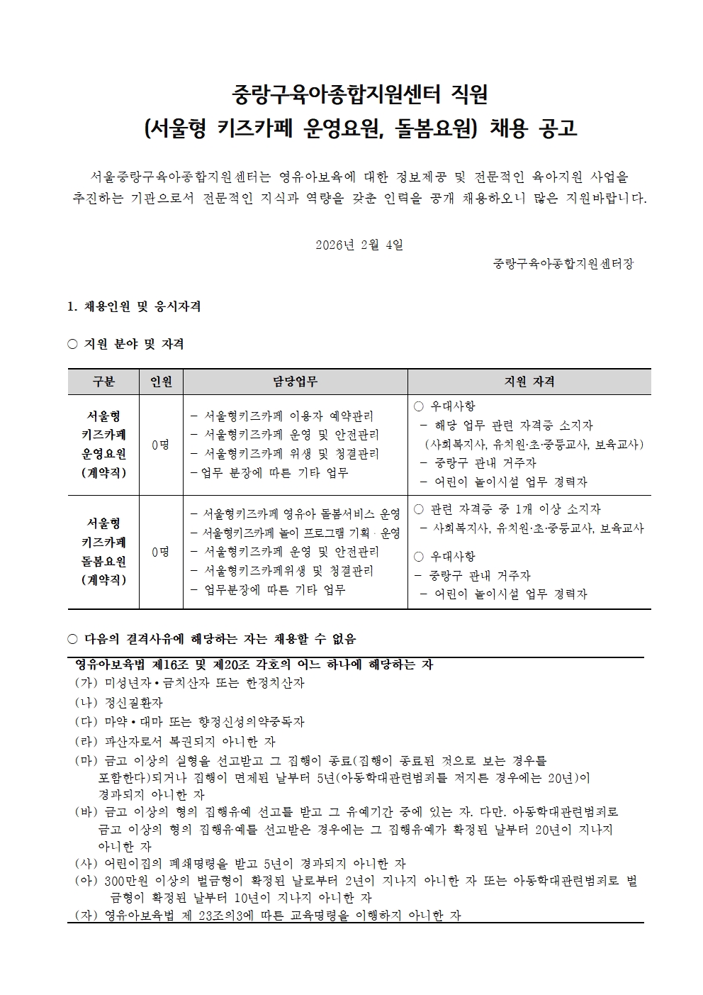 [서울 중랑구육아종합지원센터] 서울형 키즈카페 운영요원, 돌봄요원 채용 공고