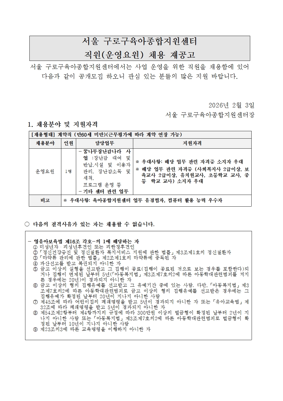 붙임 1. 서울 구로구육아종합지원센터 직원(운영요원) 채용 모집 재공고(26.2.3).pdf