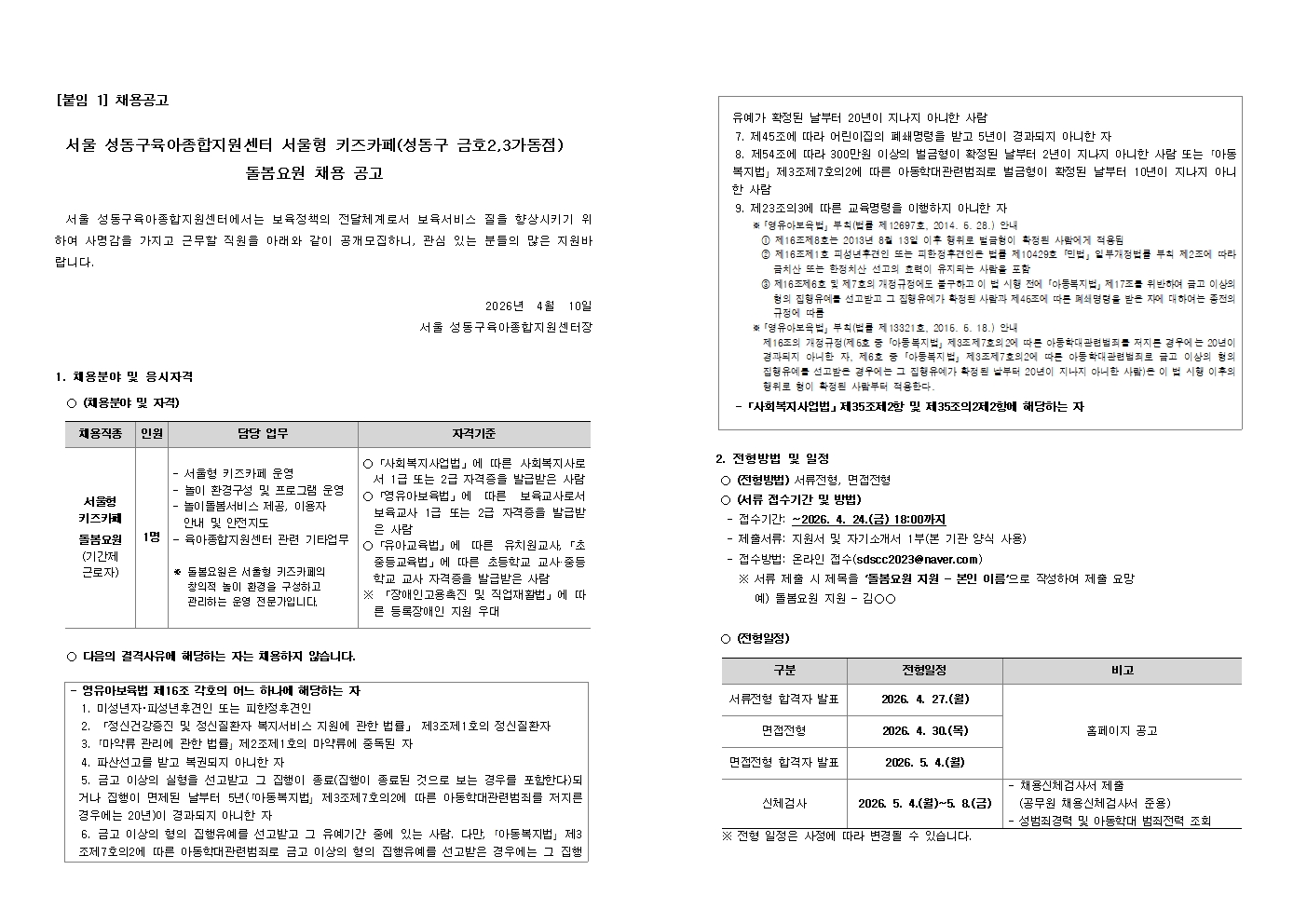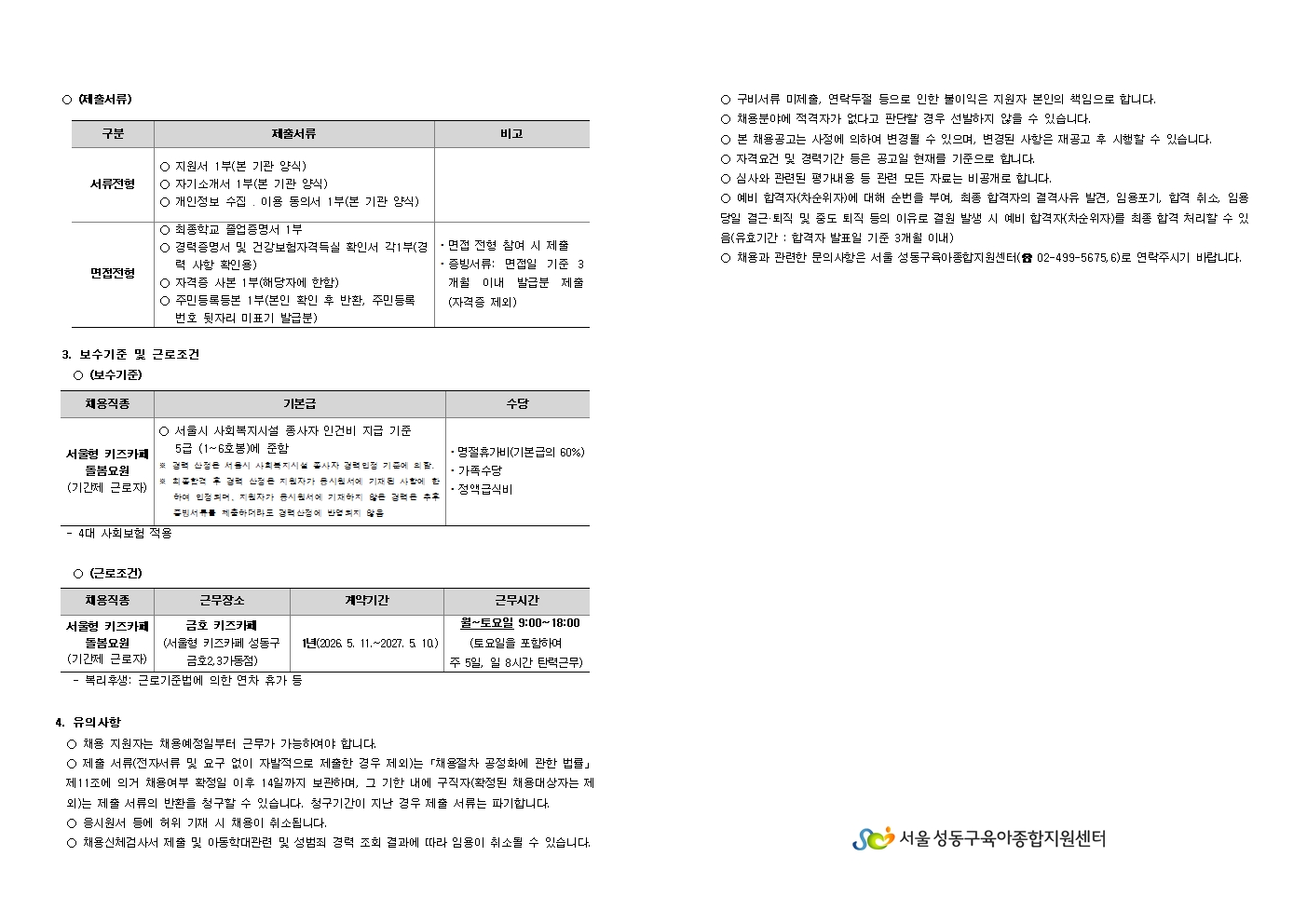 [서울 성동구육아종합지원센터] 서울형 키즈카페(금호2,3가동점) 돌봄요원 채용 공고