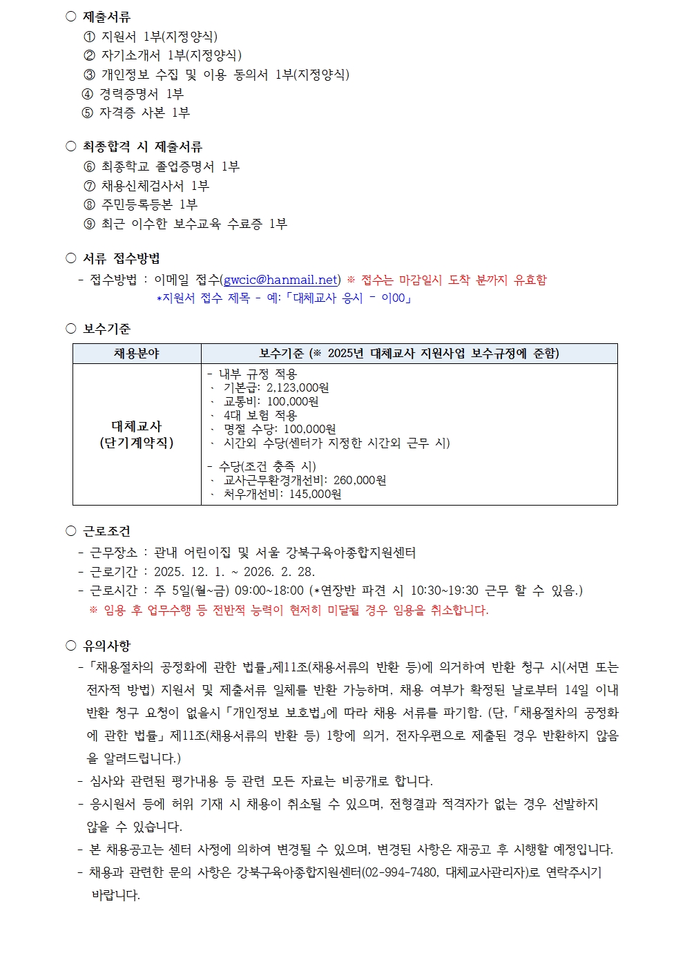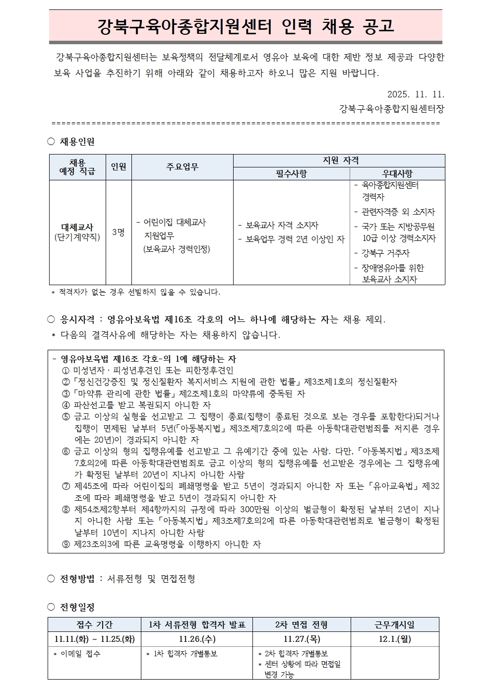 [서울 강북구육아종합지원센터] 대체교사 채용 공고