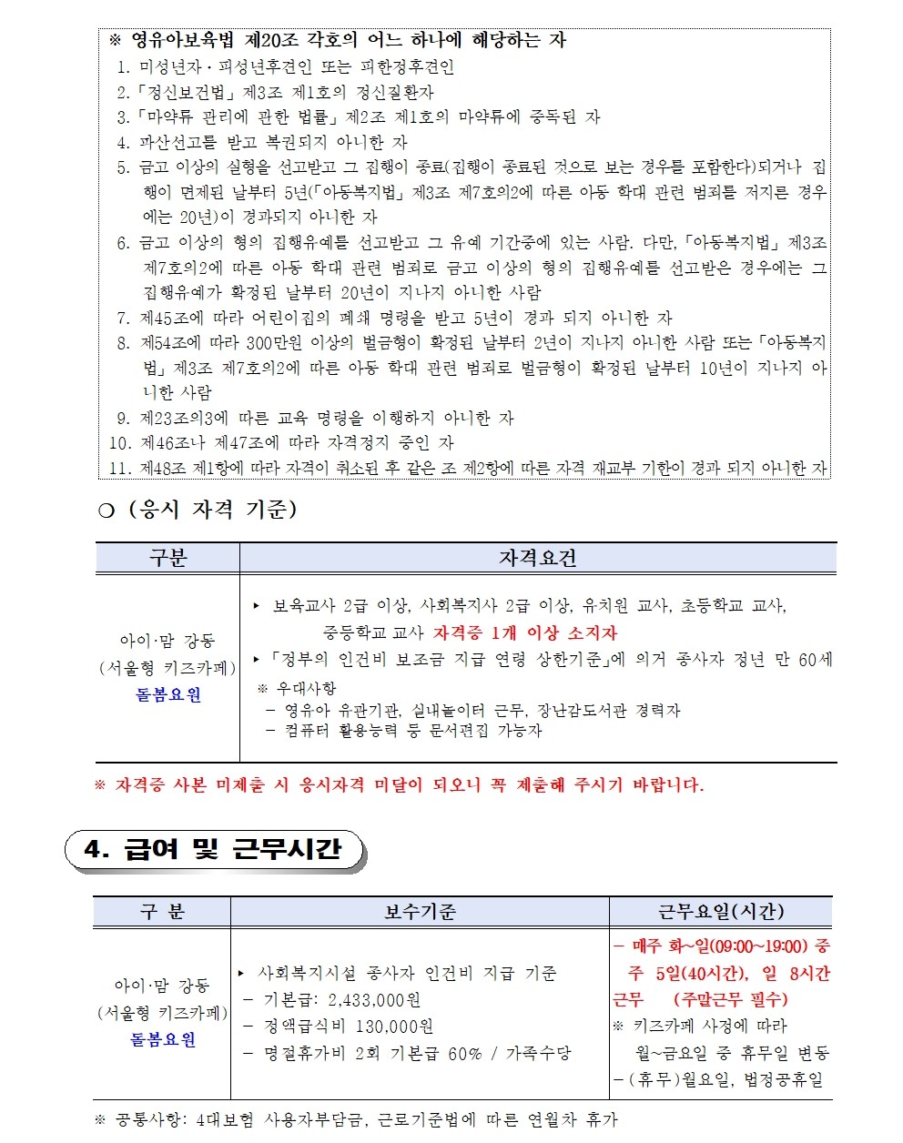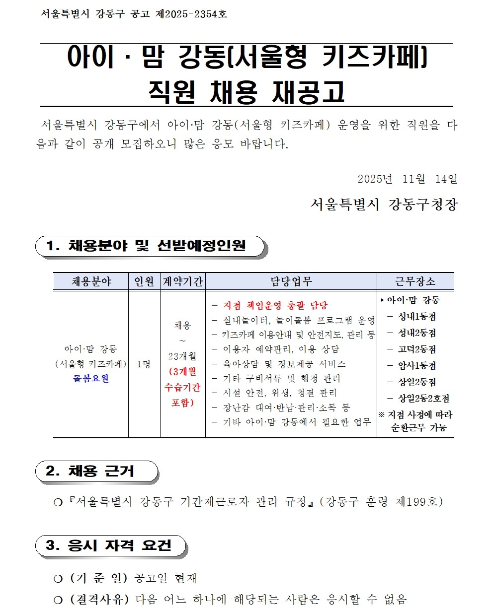 [서울 강동구육아종합지원센터] 아이·맘 강동(서울형 키즈카페) 직원 채용 공고