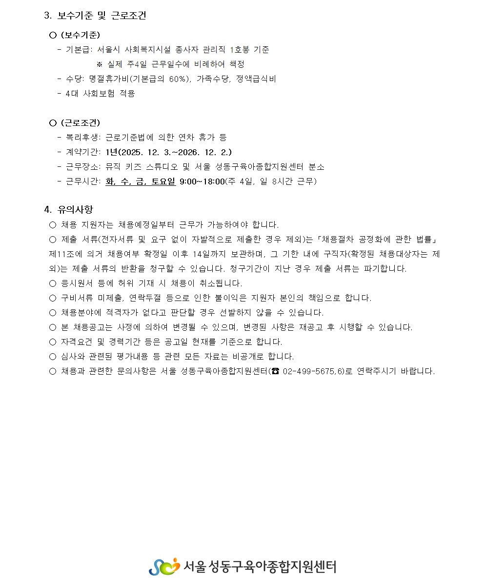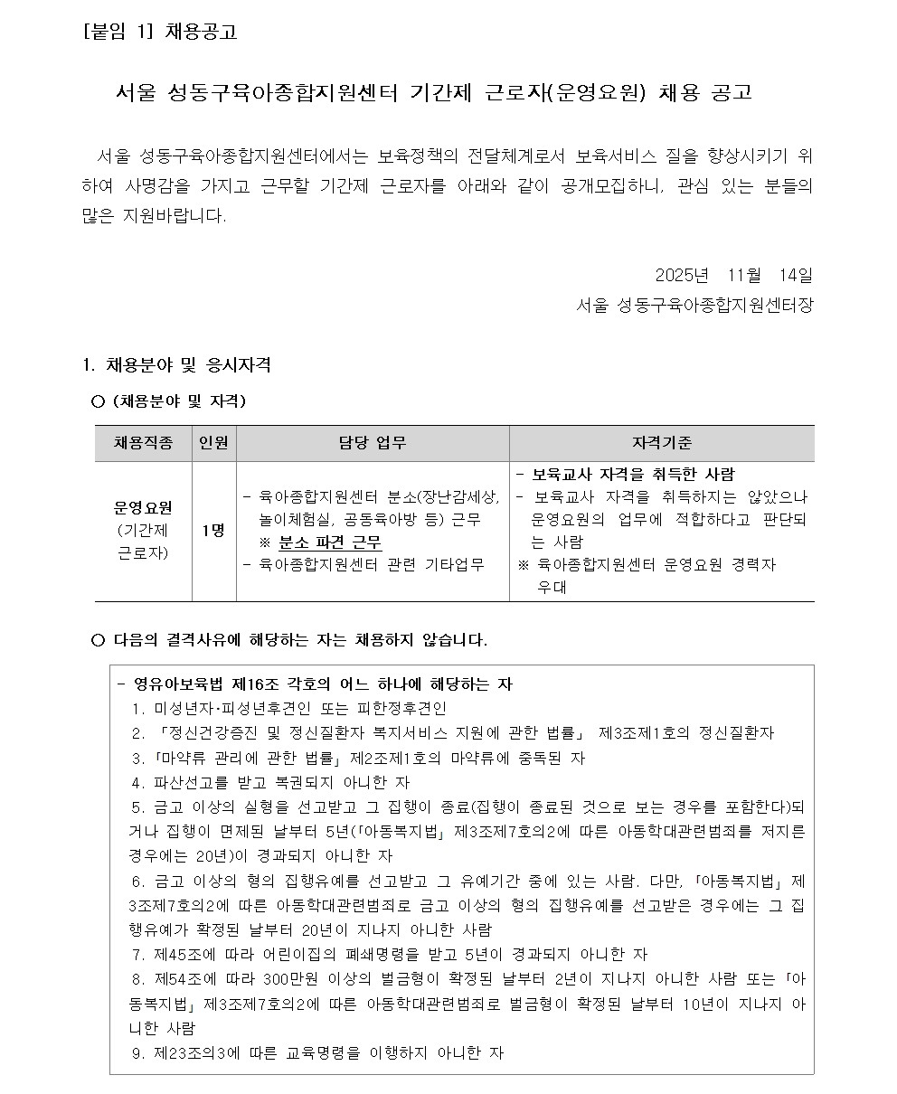 [서울 성동구육아종합지원센터] 기간제 근로자(운영요원) 채용 공고