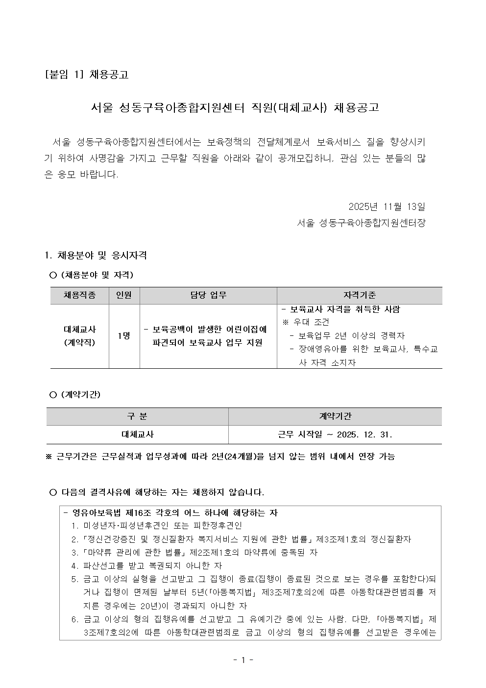[서울 성동구육아종합지원센터] 대체교사 채용 공고