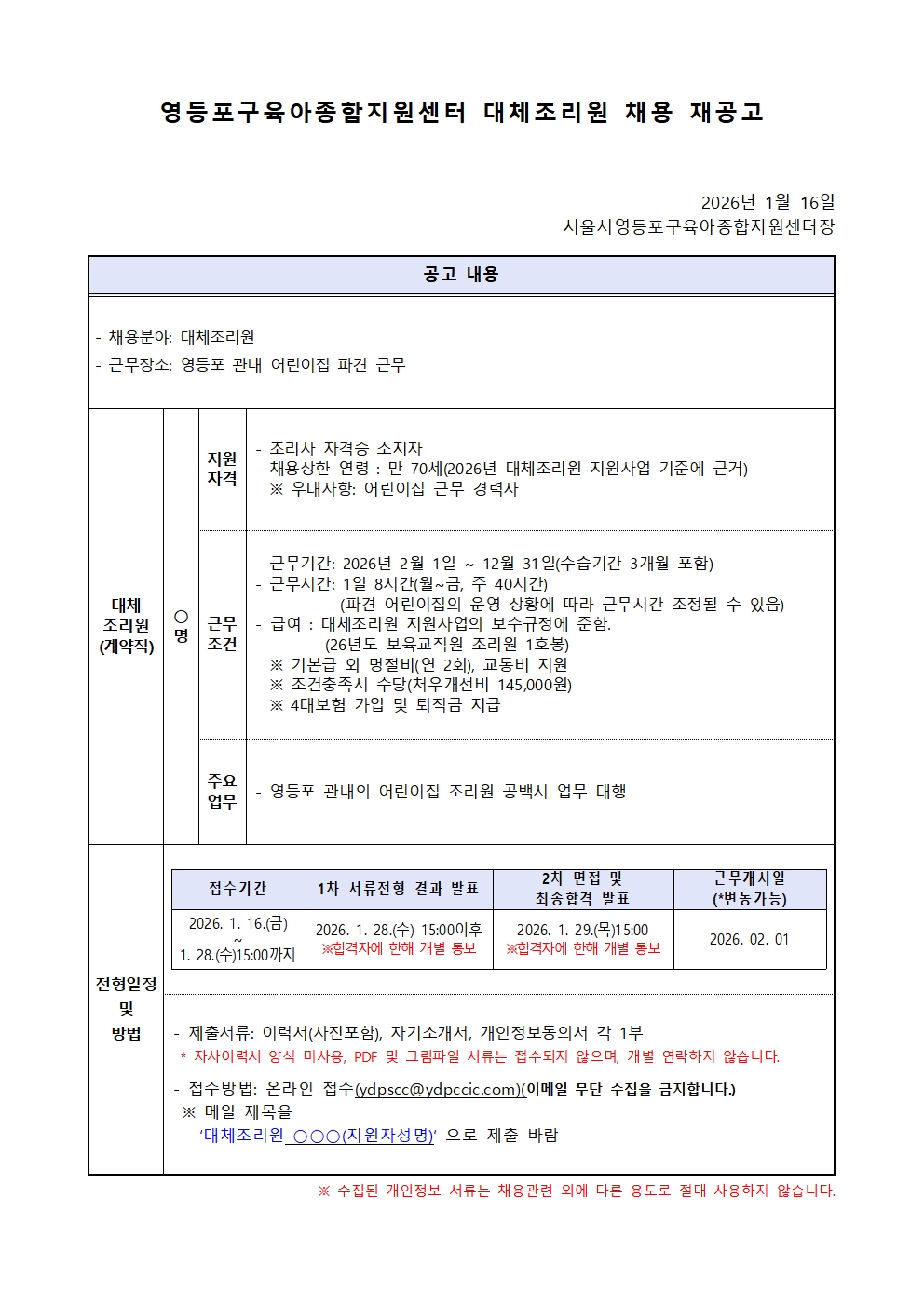 [서울 영등포구육아종합지원센터] 대체조리원 채용 공고