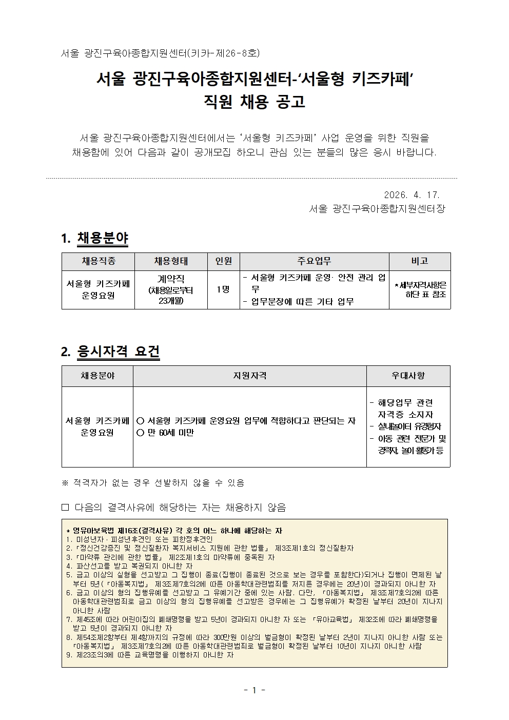 붙임1. 서울 광진구육아종합지원센터-_서울형 키즈카페_ 직원 채용 공고(키카-제26-8호).pdf