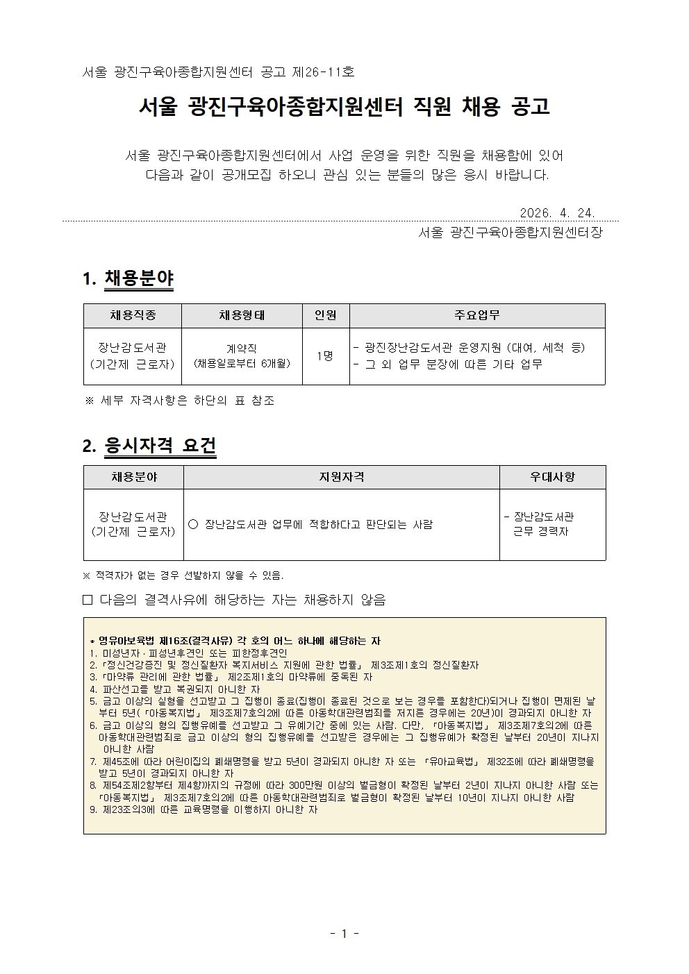 붙임 1. 서울 광진구육아종합지원센터 직원 채용 공고 (제26-11호).pdf
