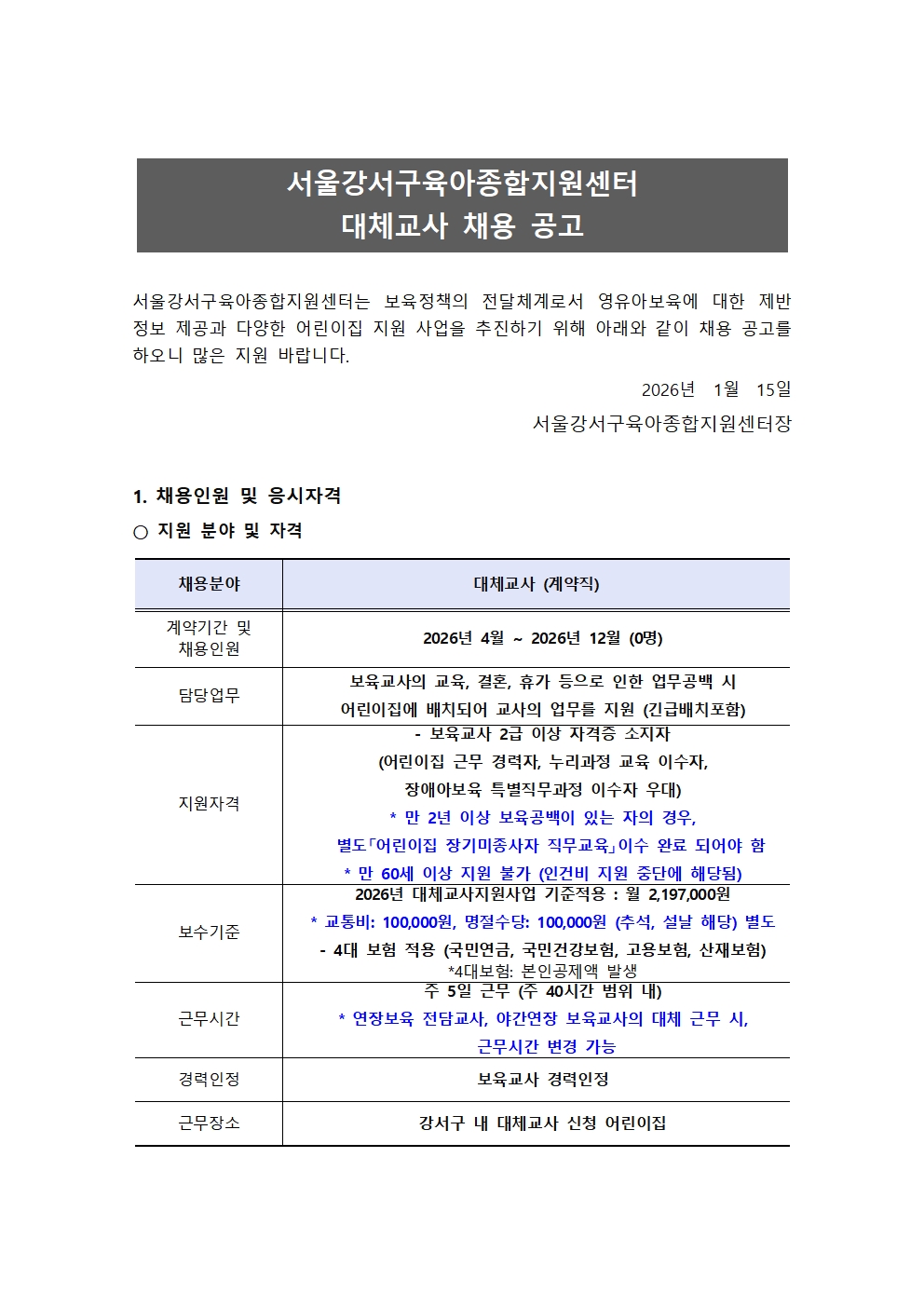 [서울 강서구육아종합지원센터] 대체교사 채용 공고