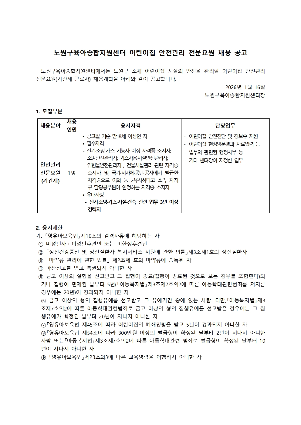 [서울 노원구육아종합지원센터] 어린이집 안전관리 전문요원 채용 공고