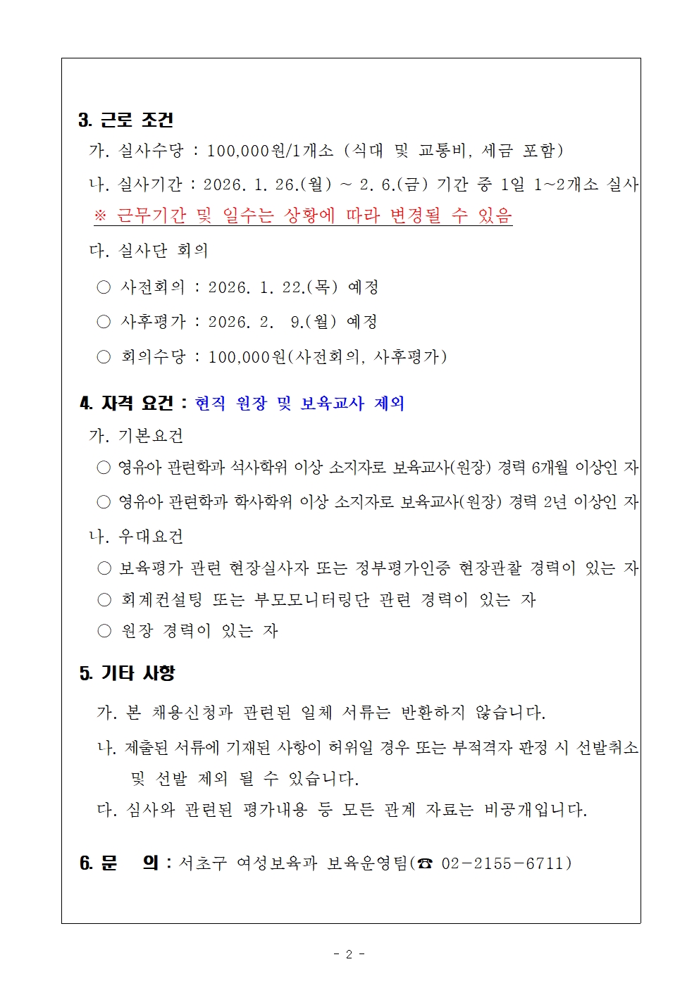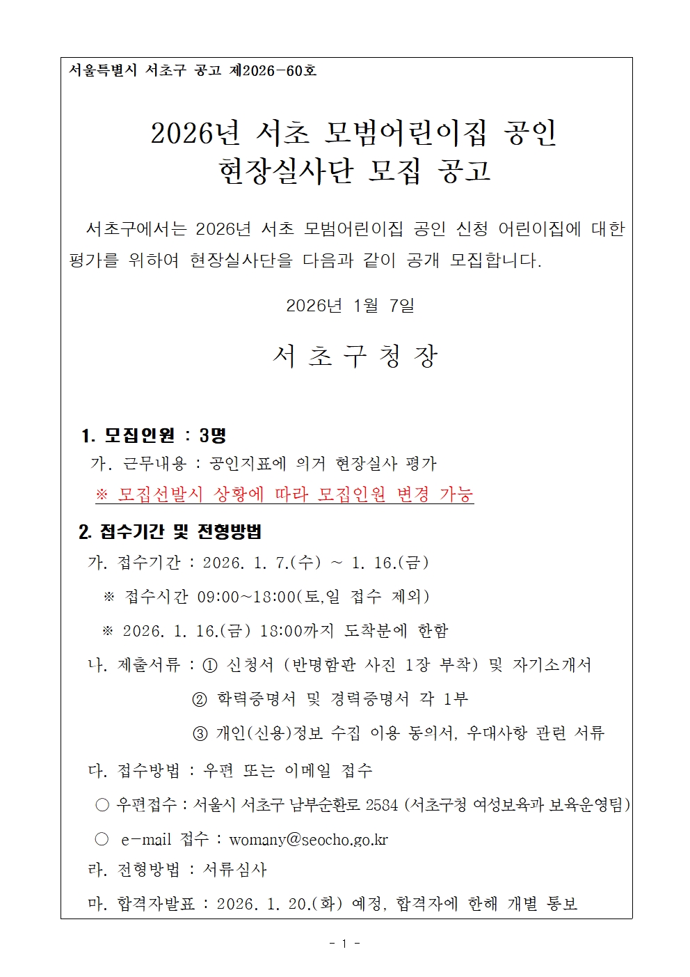 [서초구청 여성보육과] 2026년 서초 모범어린이집 공인 현장실사단 모집 공고
