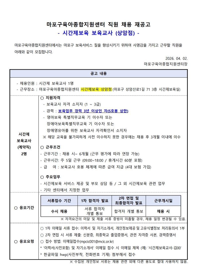 붙임?1. 마포구육아지원종합센터 직원 채용 재공고(시간제보육 보육교사).pdf