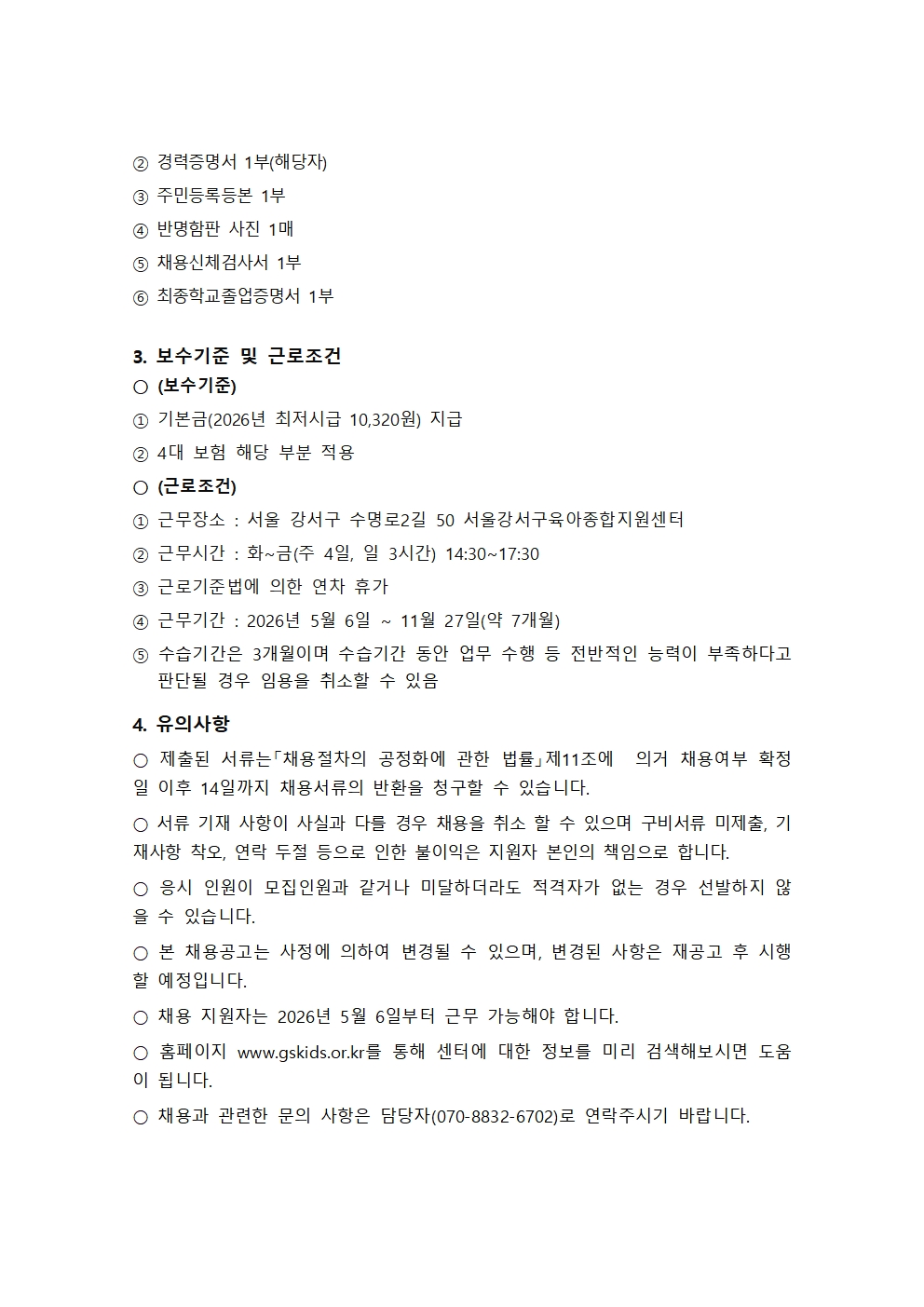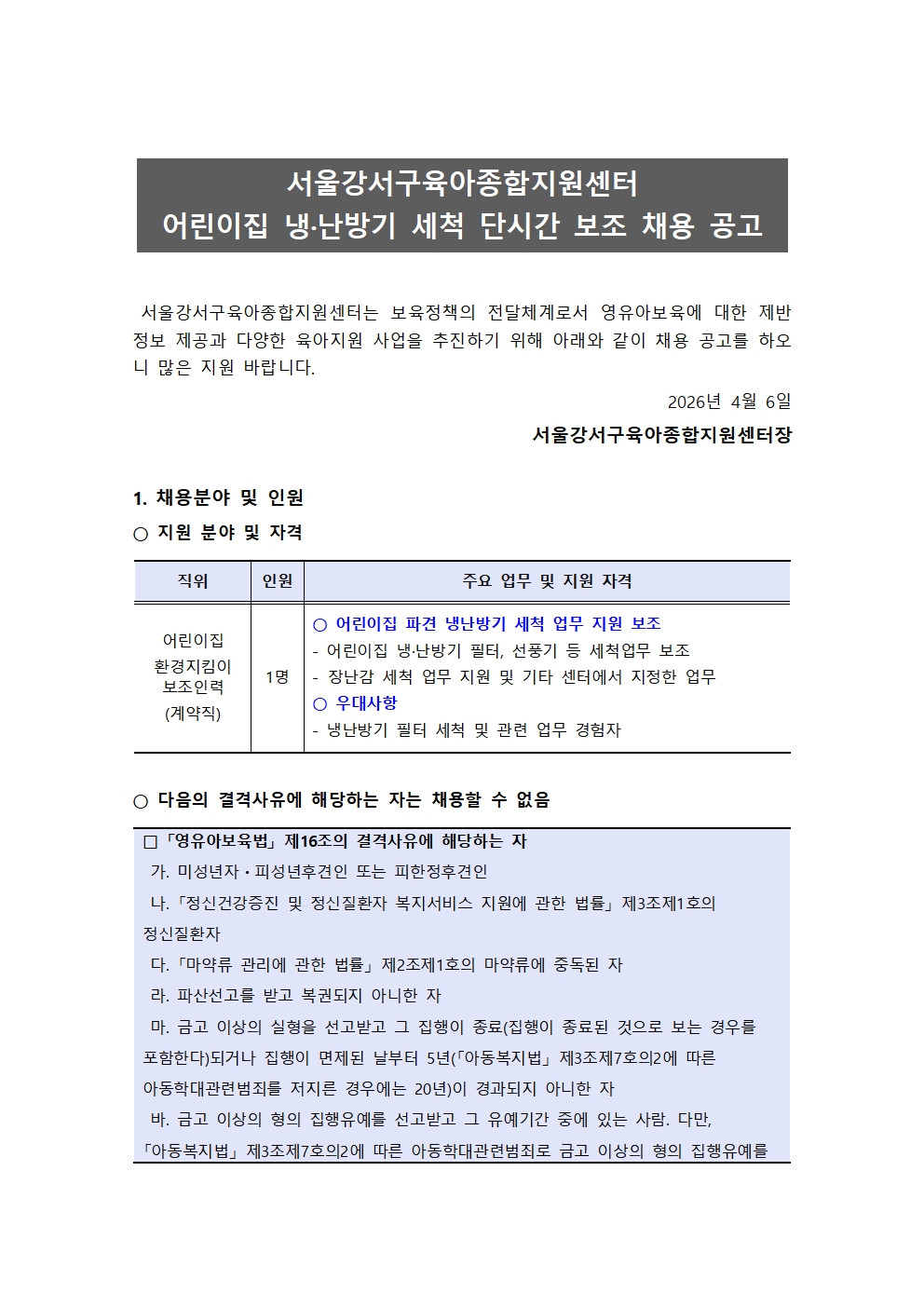 [서울 강서구육아종합지원센터] 어린이집 환경지킴이 보조인력 채용 공고