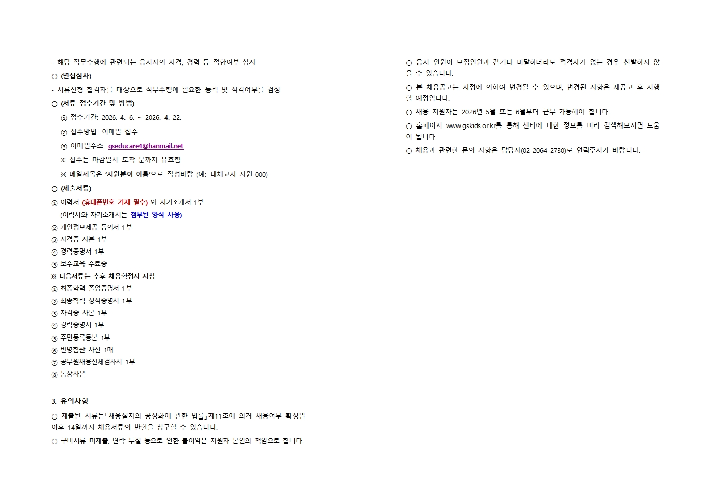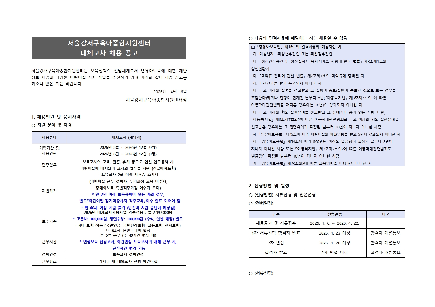 [서울 강서구육아종합지원센터] 대체교사 채용 공고