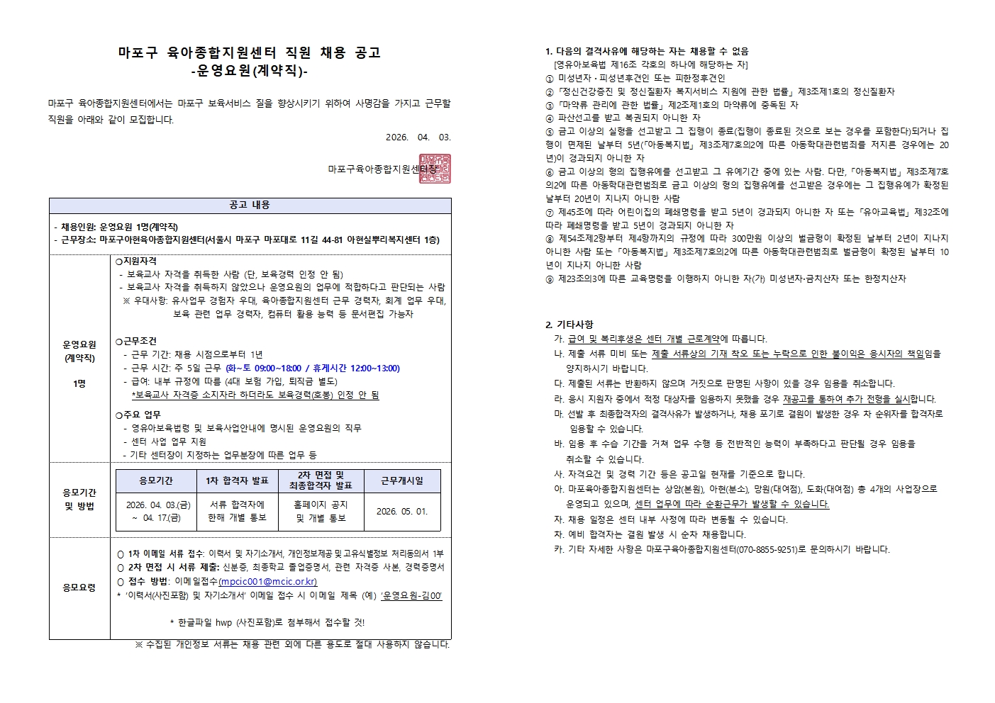 [0403] 붙임 1. 마포구육아종합지원센터 직원 채용 공고(운영요원).pdf