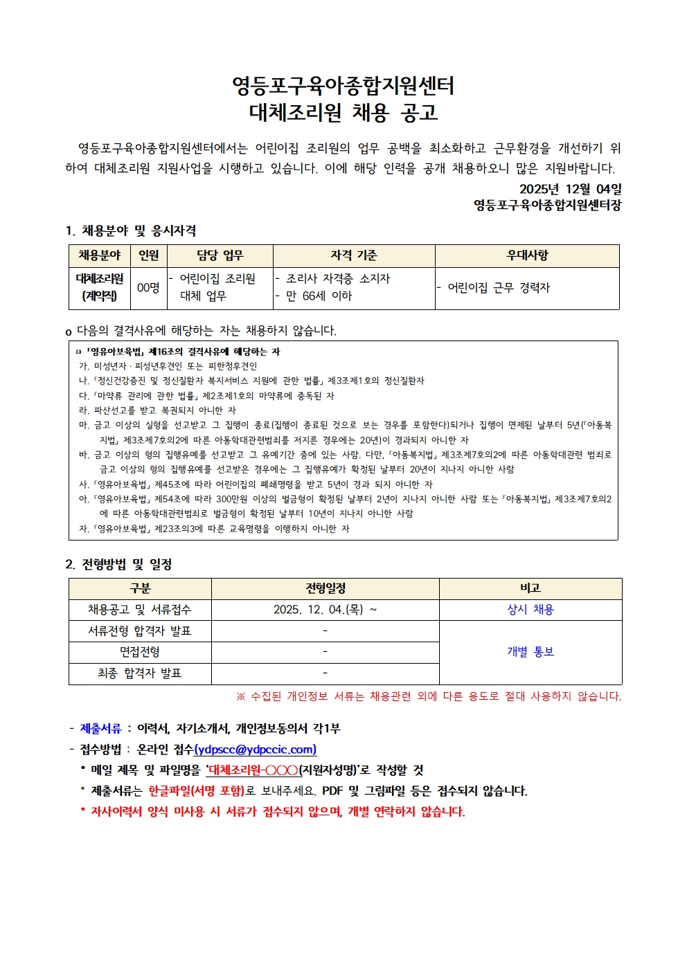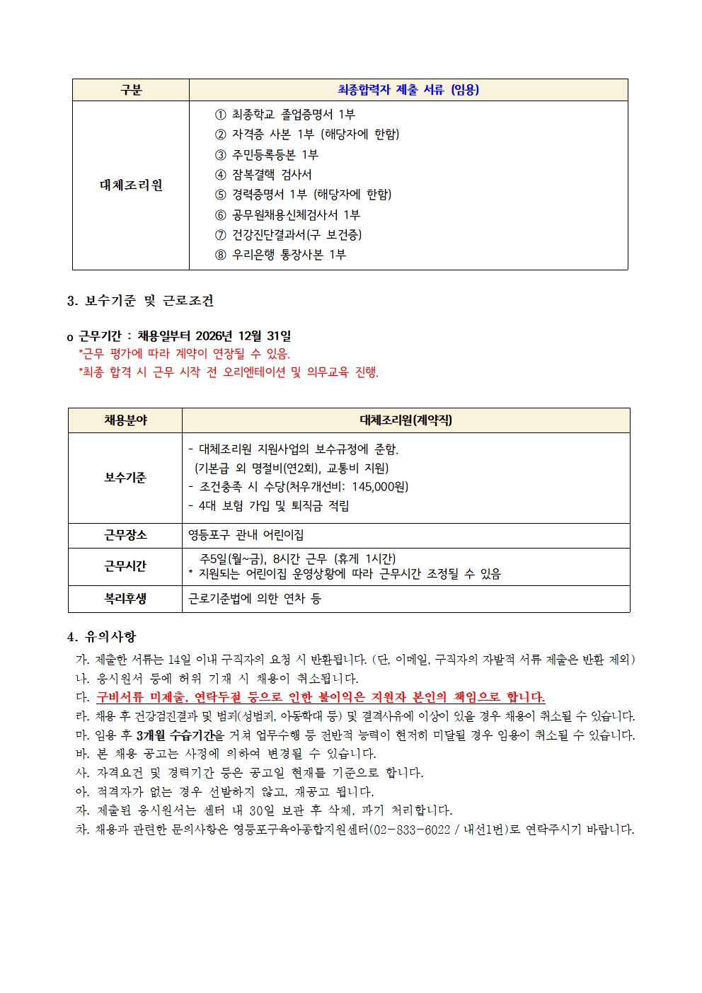 [서울 영등포구육아종합지원센터] 대체조리원 채용 공고