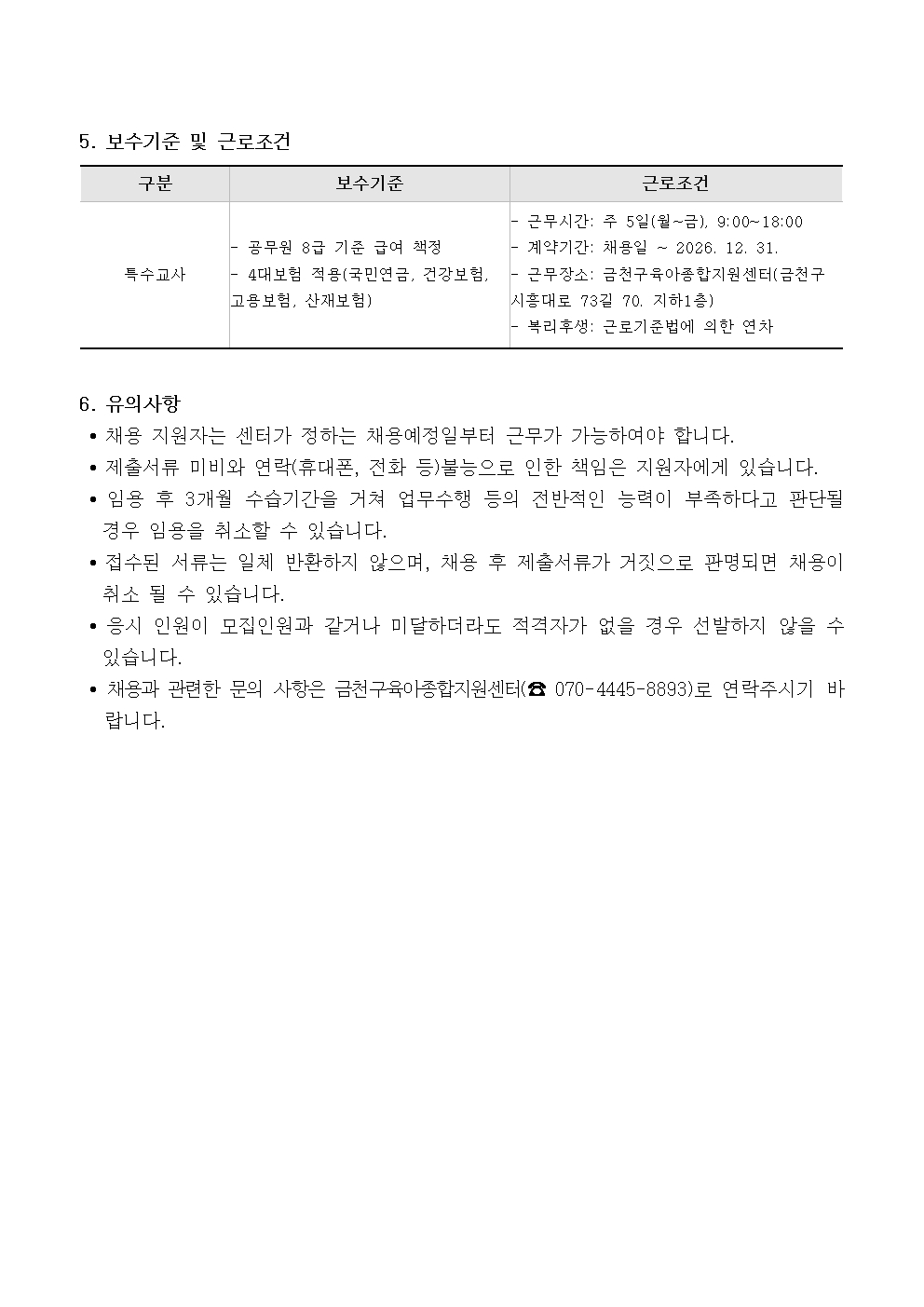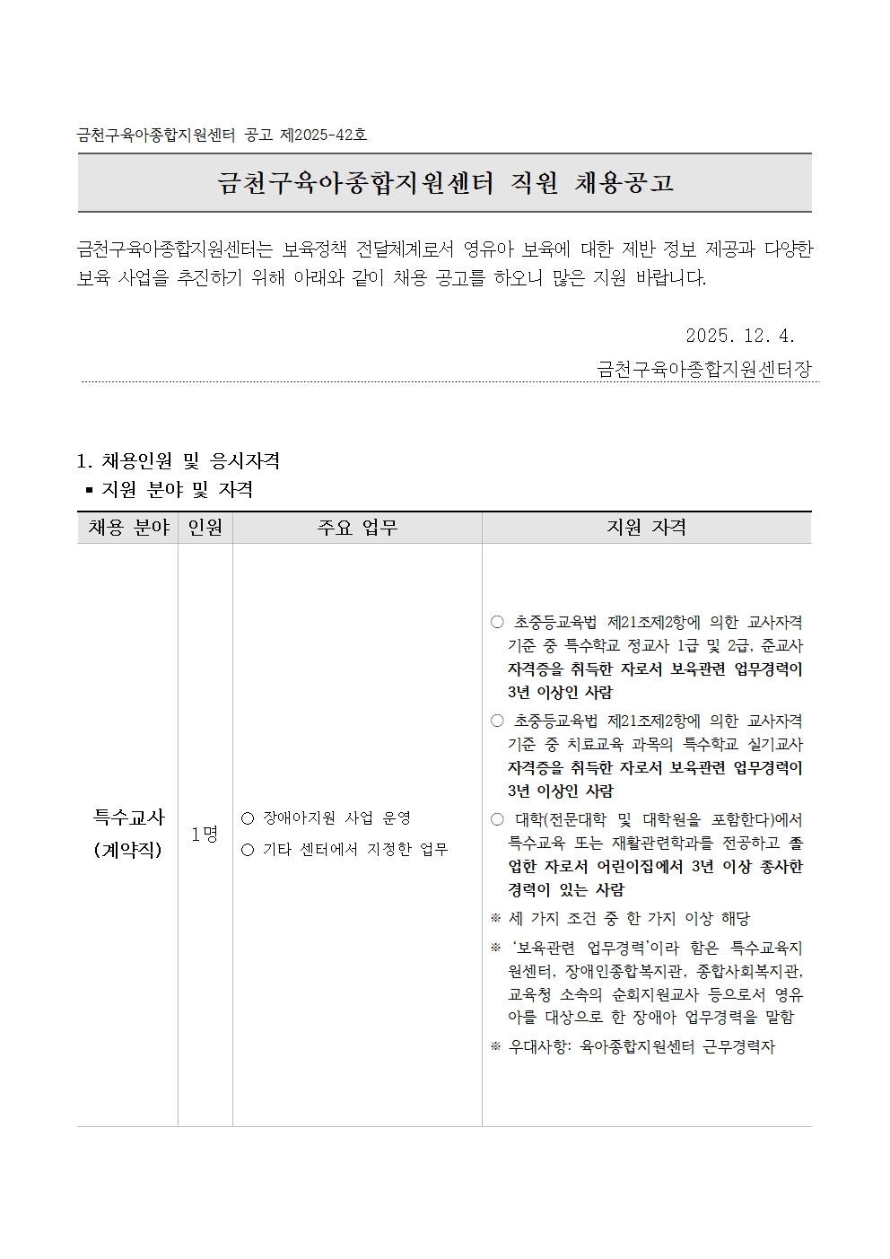 [서울 금천구육아종합지원센터] 특수교사 채용 공고