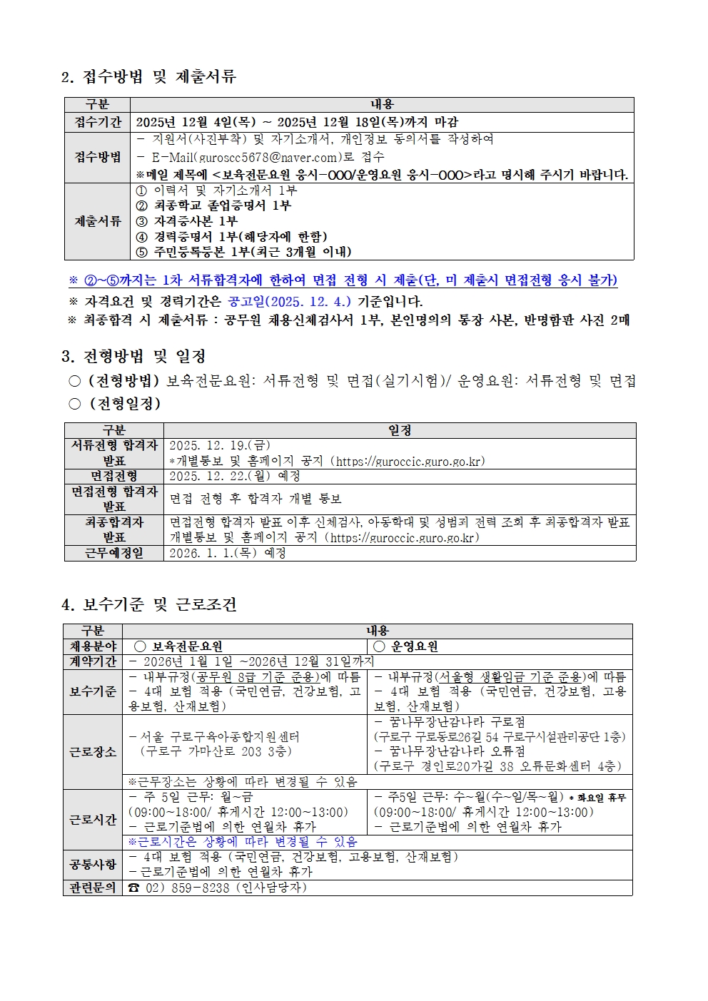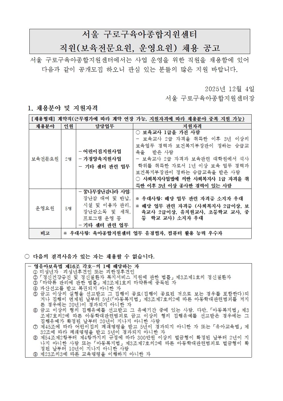 붙임 1. 서울 구로구육아종합지원센터 직원(보육전문요원, 운영요원) 채용 모집 공고문(251205).pdf