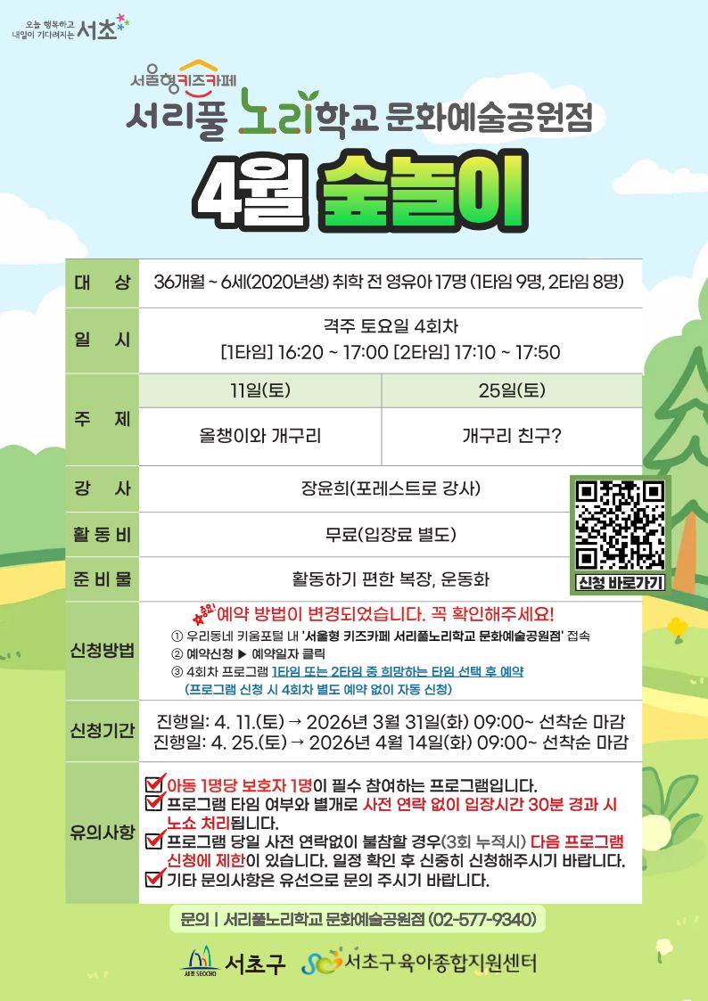 ◎4월 숲놀이 프로그램 안내◎ 1. 문화예술공원점 격주 토요일 4회차 '숲놀이 프로그램' 예약 확정자